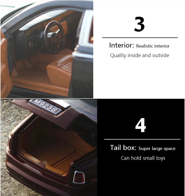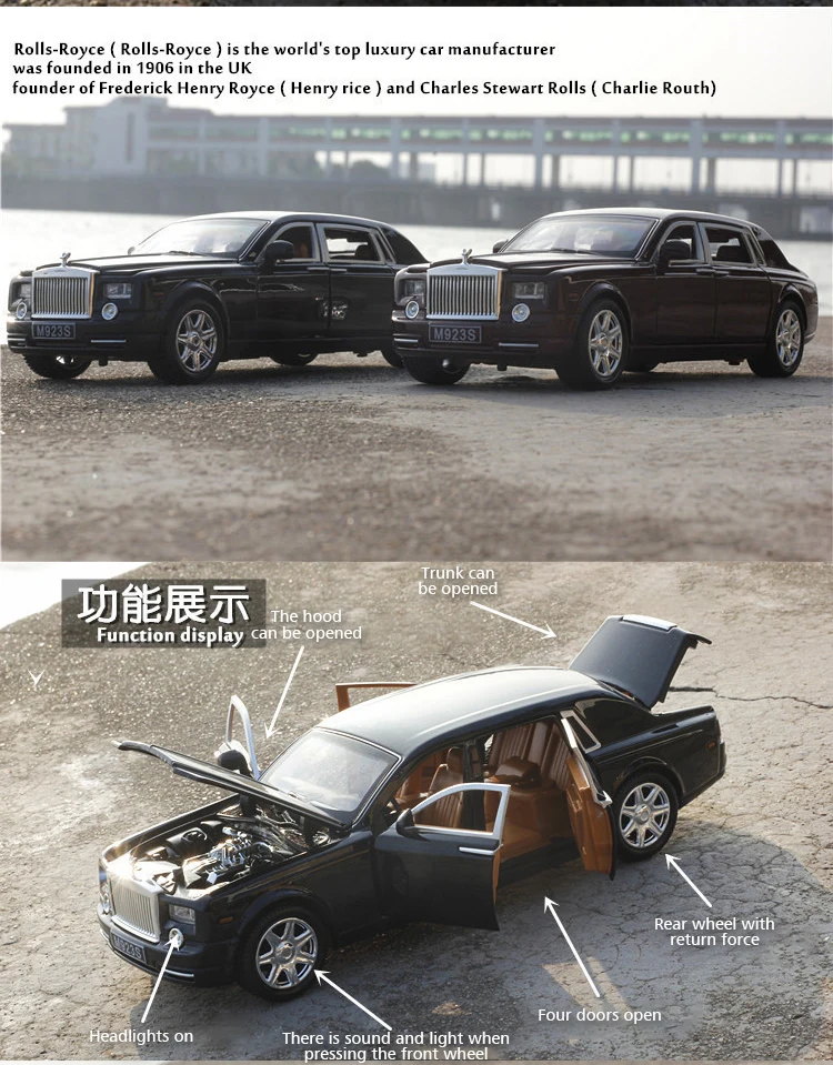 1. Литая модель: роскошная модель 1/24 2. Материал: металлический корпус + пластиковое шасси + резиновая шина 3. Товар Размеры: 20*6,2*5,4 см. 4. Функция: светильник и музыка, 6 дверей могут быть открыты 5. Цвет: черный/красный