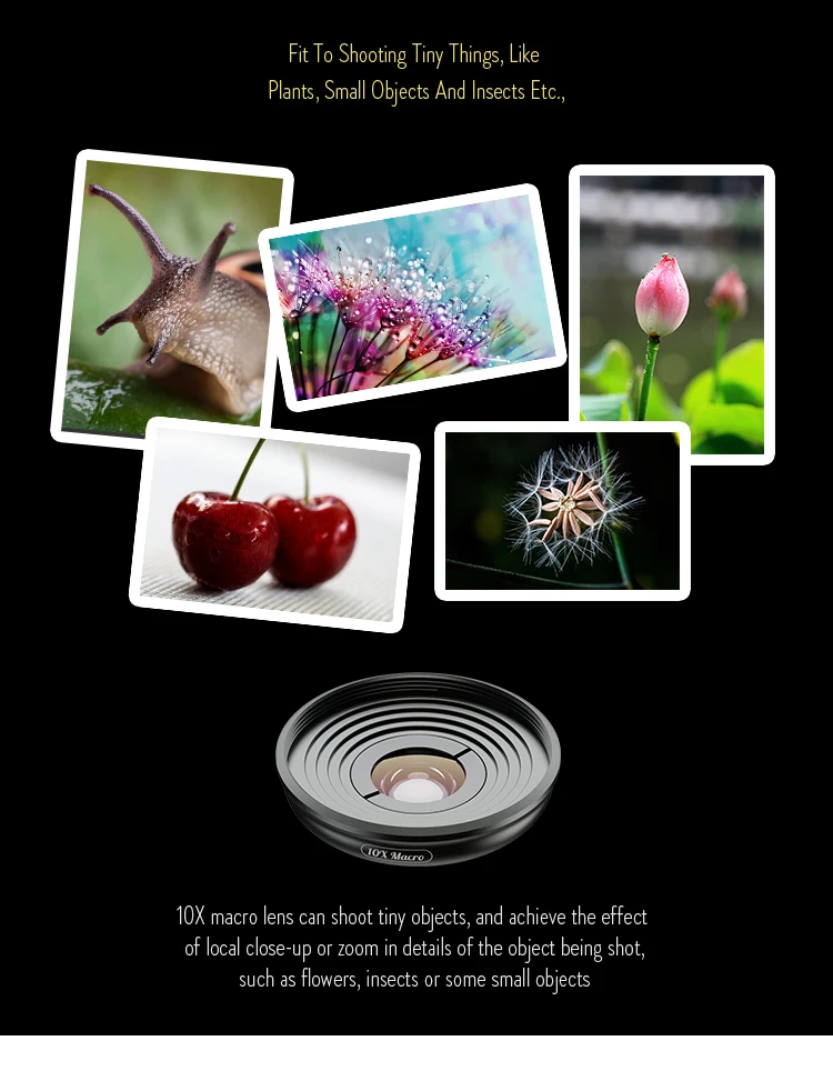 Увеличение: 10x Конструкция объектива: 1 элемент в 1 группа Максимальный диаметр: 20 мм Длина: 12 мм Расстояние съемки составляет от 10 до 23 мм