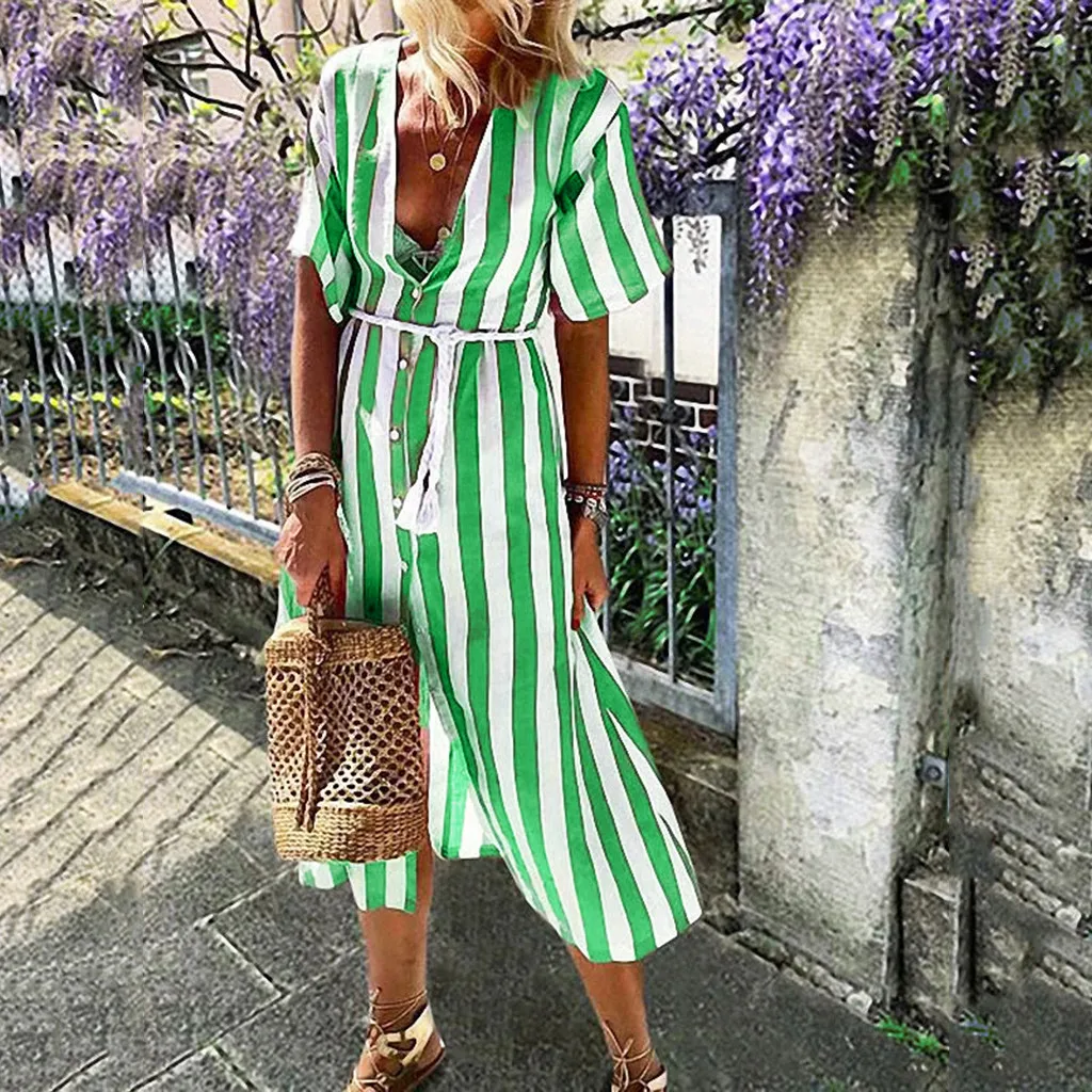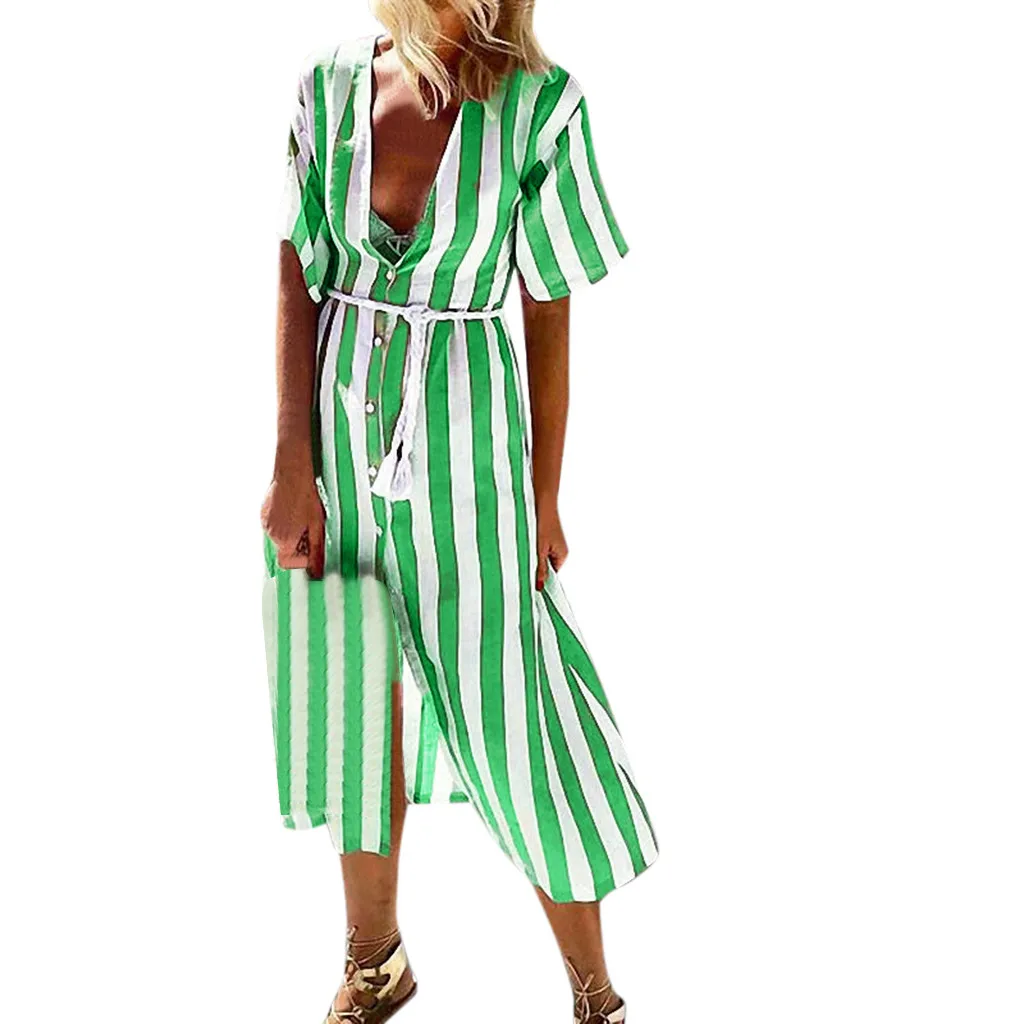 Женское летнее платье с глубоким v-образным вырезом в полоску, с коротким рукавом, длинное, вечерние, Пляжное Платье