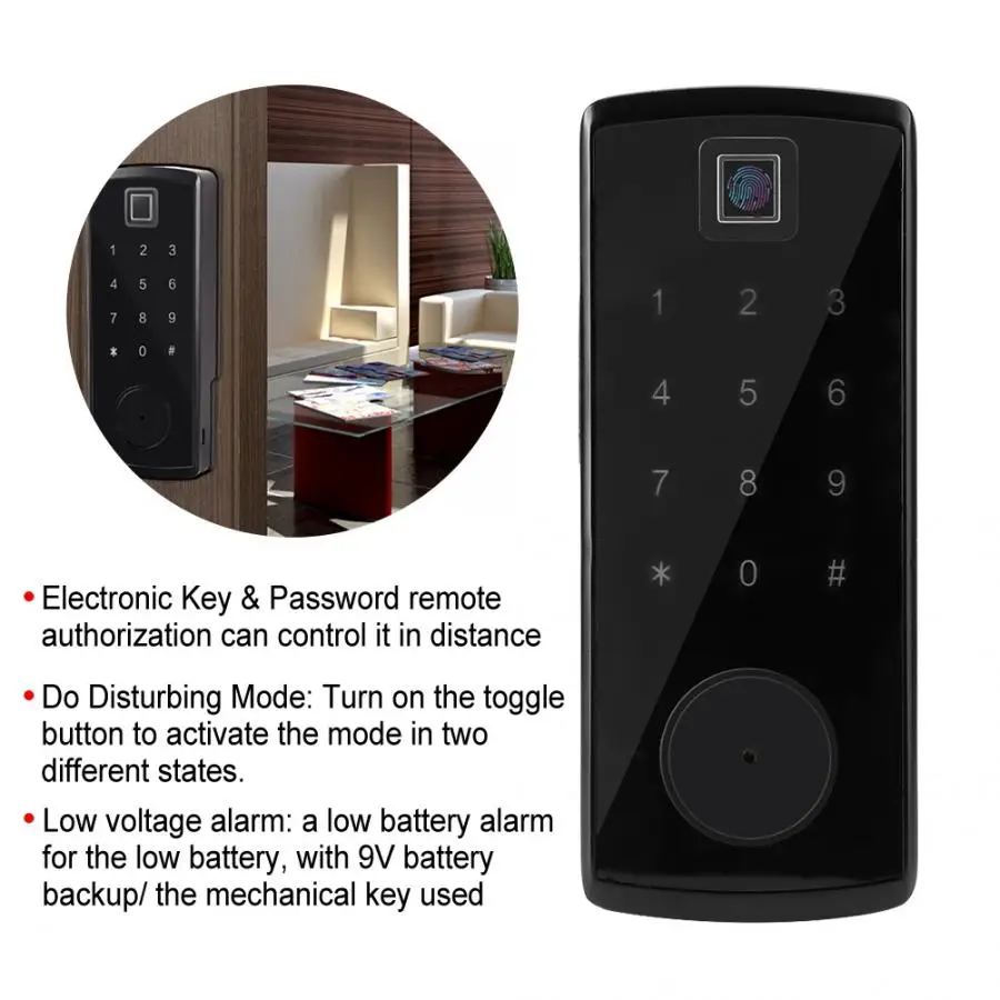 6 в 1 разблокировка: интеллектуальная биометрическая Блокировка без ключа, пароль + Bluetooth + отпечаток пальца + карта + Разблокировка ключа + временное разблокирование паролем в приложении. Клавиша Bluetooth: после подключения телефона и дверного замка Откройте Bluetooth, мобильное приложение и Разблокируйте телефон. Пароль Administrator: после подключения телефона и дверного замка, есть постоянный действительный пароль для открытия. Удаленное разрешение на электронный ключ: управляющий может удаленно отправить электронный ключ в приложение для мобильного телефона другого человека. Может ограничивать время использования электронного ключа, мгновенно замораживать, размораживать и удалять электронный ключ. Пароль удаленное авторизация: когда дверной замок не подключен, постоянный пароль и ограниченный по времени пароль могут быть отправлены удаленно. Защита паролем: Смарт-Блокировка автоматически блокируется в течение 5 минут после того, как введите неправильный пароль в течение 5 раз. Может вводить любое количество паролей перед правильным паролем. Последние несколько цифр могут заблокировать дверь для правильного пароля. Автоматическая блокировка: после разблокировки можно установить автоматическое блокирование через 5-120 секунд после разблокировки. Обычный замок: Нажмите и удерживайте кнопку «#» около 5 секунд. Низкое энергопотребление: 4 щелочные батарейки AA, могут быть разблокированы около 5000 раз (около 6 месяцев) Сигнализация низкого напряжения: сигнал низкого заряда батареи для низкого заряда батареи. При использовании ключа Bluetooth и открытии сети клиент приложения будет отображать мощность в режиме реального времени. Можно использовать резервную батарею 9 В или механическую клавишу, чтобы временно разблокировать, когда батарея выключена. Мониторинг в режиме реального времени: Пользователь разблокирует приложение или пароль, и пользователь может проверить записи в записи разблокировки приложения. Напоминание в режиме реального времени: После подключения устройства блокировки двери нажмите в правом верхнем углу интерфейса, чтобы запросить полученную запись ключа Bluetooth и другую информацию о пользователе. Режим беспокойства: Нажмите кнопку, чтобы активировать функцию конфиденциальности в заблокированном состоянии. Включите кнопку переключения, чтобы активировать режим канала в разблокированном состоянии.