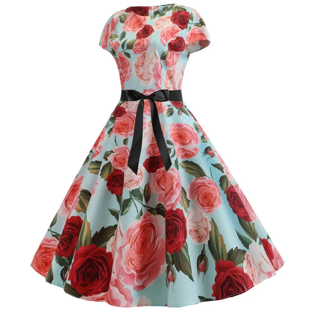 Women Vintage 1950s Retro Short Sleeve Print Evening Party Gown Prom Swing Dress