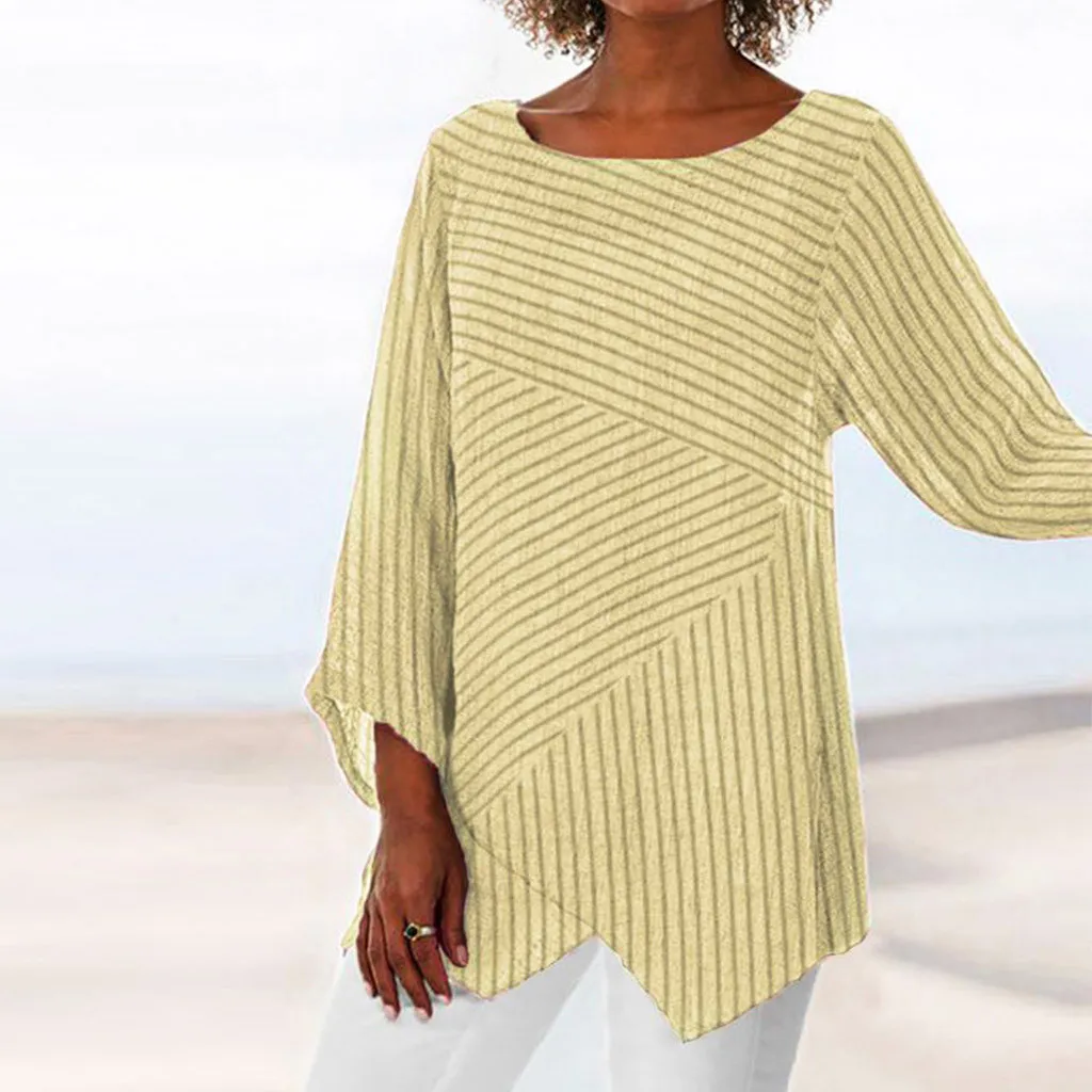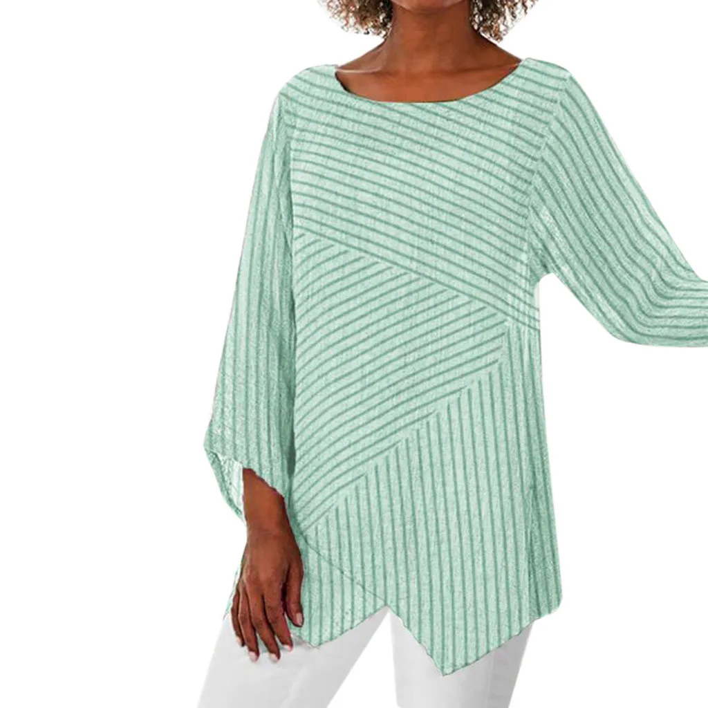 Особенности: модные топы с длинными рукавами; Повседневная футболка; Круглый вырез; Короткий рукав; Принт в полоску;Асимметричный Подол ,Модная одежда; Стильный и модный дизайн; Летние повседневные топы