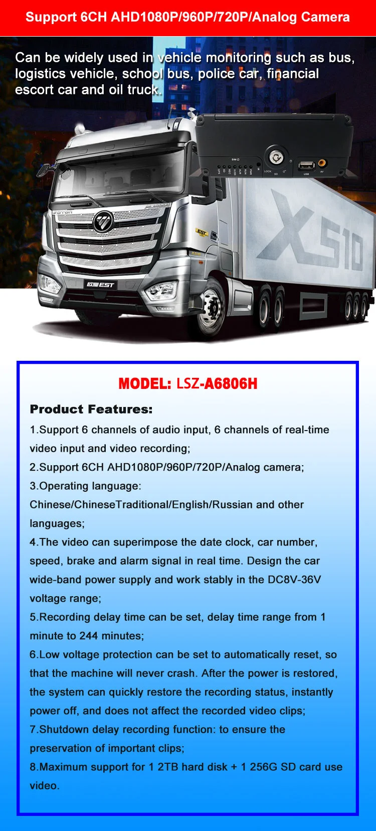 2.Поддержка 6CH1080П/720PHD видео вход в реальном времени. Кроме того, поддержка 6-канальных аналоговых камер входов или составных входов для 4CH HD камер и 2CH аналоговых камер.