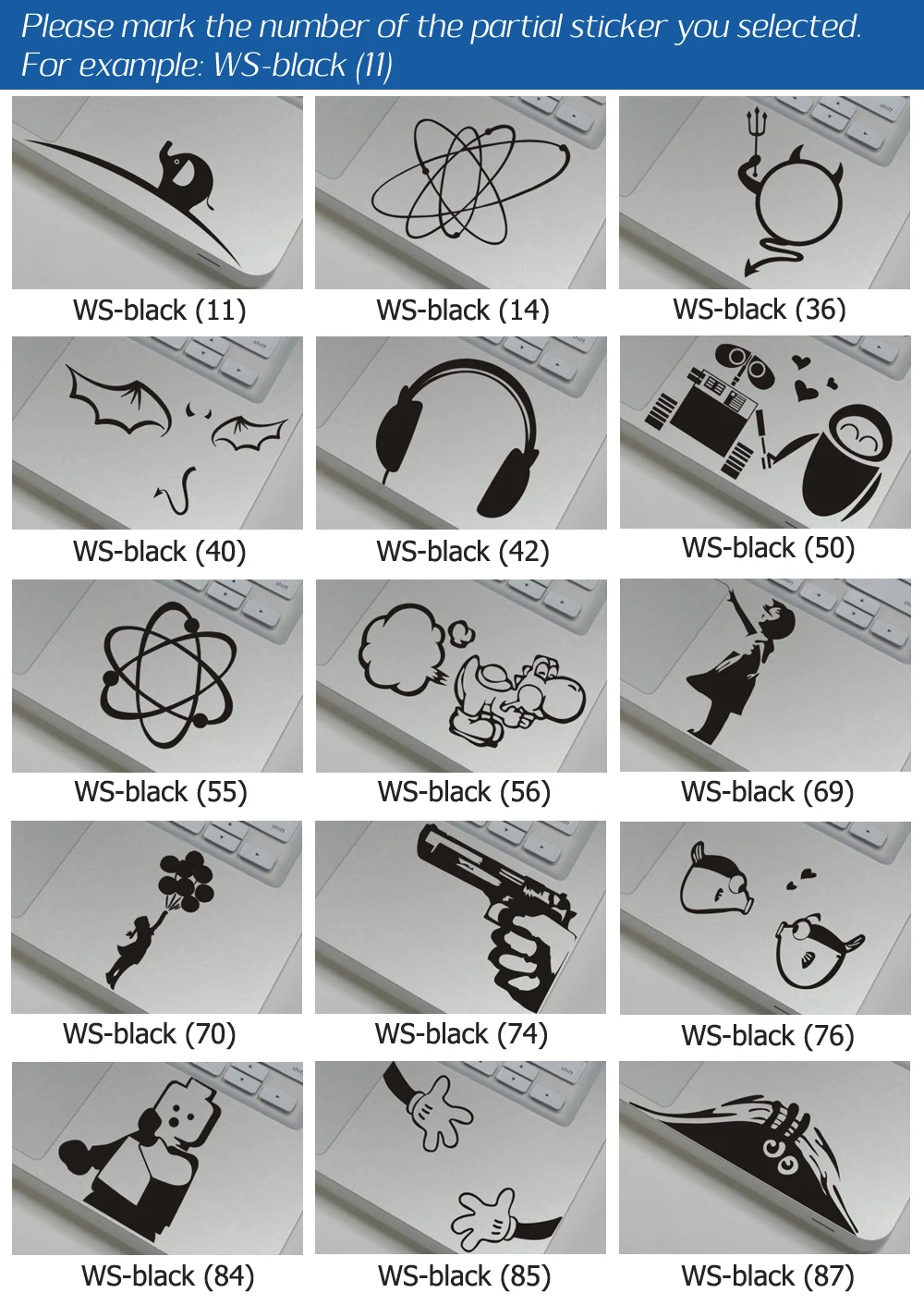 Особенности: 1. Ультра тонкий, совместимый для всех Macbook; 2. Легко наносится и снимается, долговечен и никогда не выцветает; 3. Защита от пыли, водонепроницаемость, украшение; 4. Множество моделей на выбор; 5. Изображение показывает яркий визуальный эффект, как красивая татуировка на вашем ноутбуке; 6. Посылка включает в себя: 1 частичный стикер 1 шт.; 1 руководство по эксплуатации 1 шт. Пожалуйста, оставьте номер узора ниже заказа, если вам нужны следующие узоры.