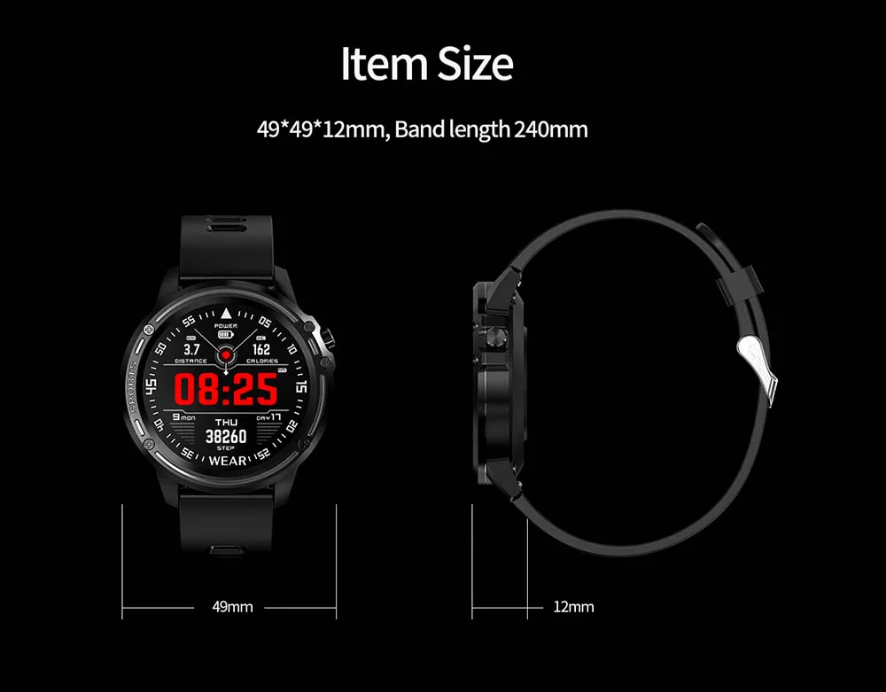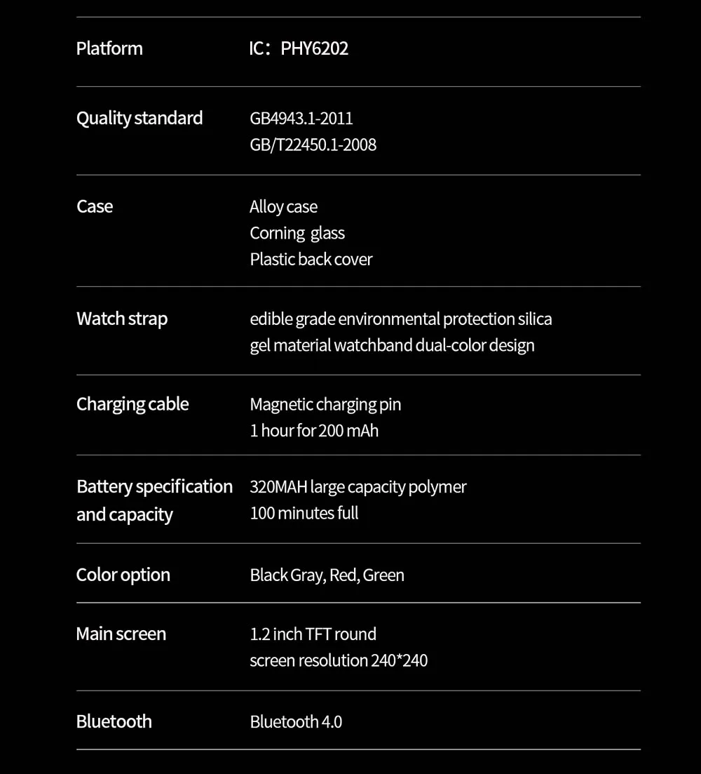 Часы L8 могут отображать несколько языков: польский, русский, французский, испанский, тайский, китайский, английский, голландский Аккумулятор: 320 мАч Время работы в режиме ожидания: > 60-90 дней, нормальное использование: > 10-15 дней Главный экран: 1,2 дюймов TFT цветной экран Разрешение: 240*240 Сенсорный экран: Полное касание Ширина ремешка: 22 мм