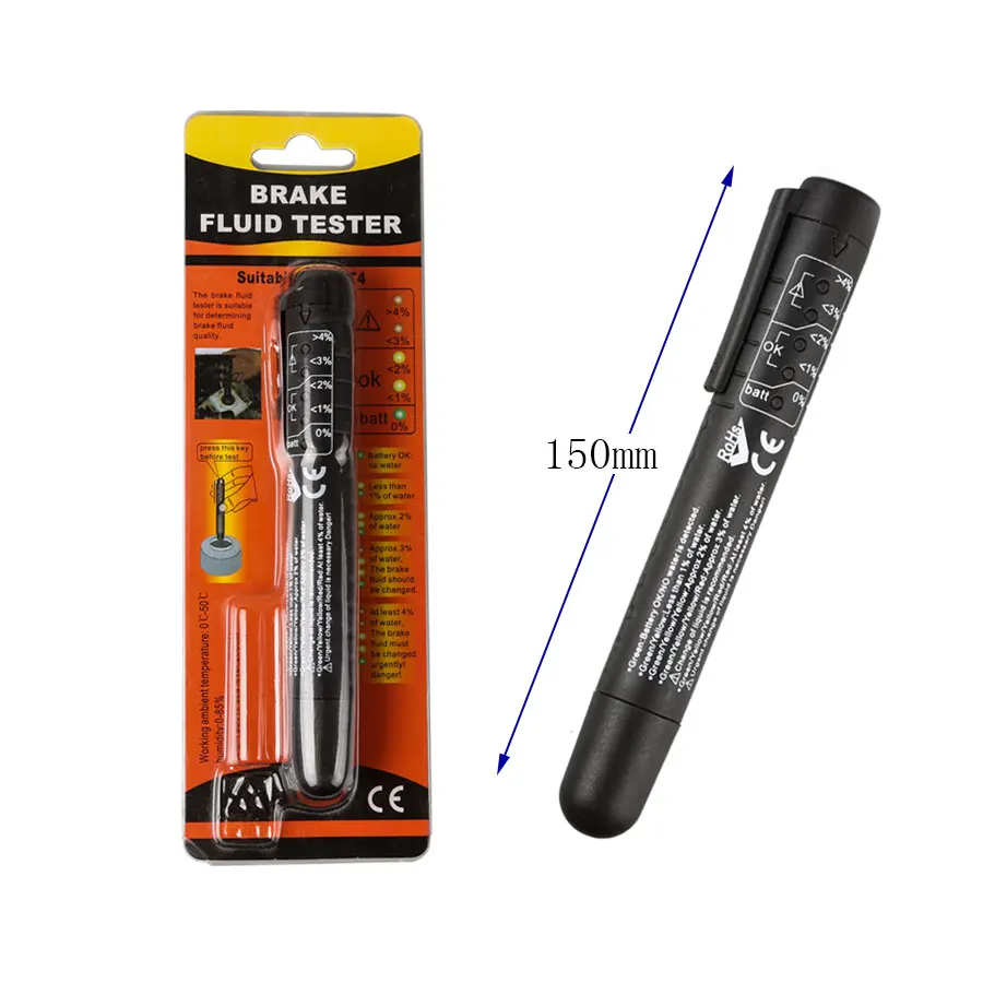 Тестер тормозной жидкости может использоваться как цифровой тестер, который подходит для определения качества тормозной жидкости. Он тестирует и указывает на пять светодиодов с точки зрения процентов воды в тормозной жидкости.