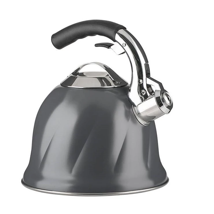Удобная не нагревающаяся ручка из бакелита. Курковой механизм открывания носика предотвращает от ожогов. Данная модель оснащена свистком, который позволяет контролировать процесс кипячения и подогрева воды.