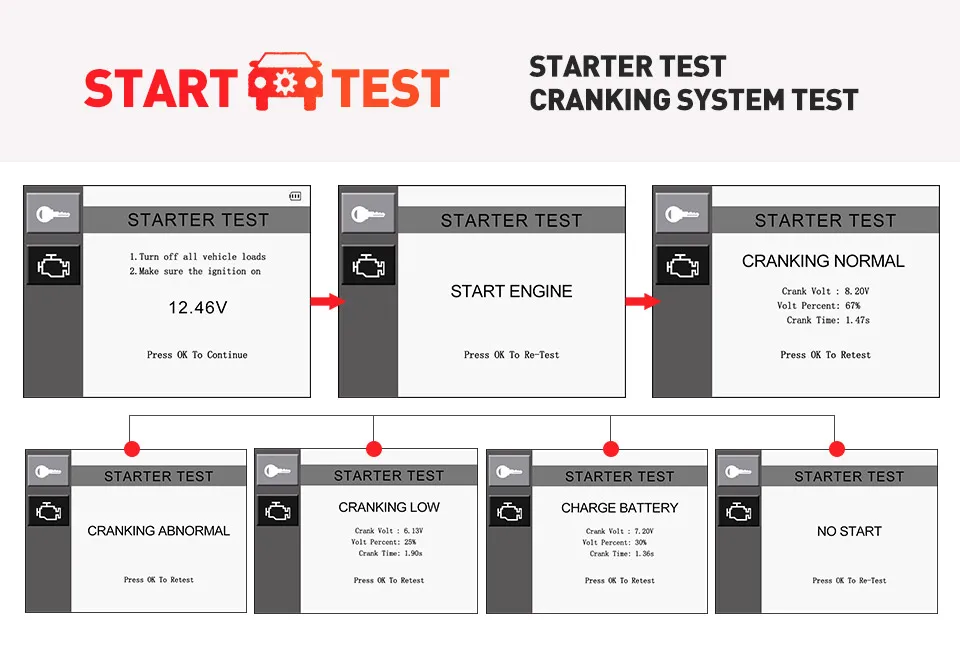 1. Извлечение информации о транспортном средстве (VIN, CIN и CVN) 2. Печать данных через ПК 3. Возможность диагностики 12 В зарядных систем, пусковых систем и состояния разряженной батареи 4. Легко читаемый AVOmeter позволяет проверить напряжение, непрерывность и ток на кончике пальца 5. Особенности уникального запатентованного ключа готовности I/M для быстрой проверки готовности к выбросам и проверки цикла привода 6. Обеспечивает быстрое и точное тестирование без нагрузки большинства типов батарей 12 В, включая AGM, стандартные и сервисные батареи 7. Яркие цветные светодиоды и встроенный динамик обеспечивают визуальный и звуковой тон для проверки готовности 8. Легко определяет причину проверки света двигателя (MIL) 9. Извлечение общих (P0, P2, P3 и U0), кодов конкретного производителя (P1, P3 и U1) и ожидаемых кодов 10. Отключает контрольный свет двигателя (MIL), очищает коды и сбрасывает мониторы 11. Отображает состояние готовности монитора и I/M (выбросов) 12. Считывает текущие PCM datastream, данные тестирования датчика O2, данные о замораживании кадров 13. Данные графиков (1996 и более новые) 14. Советы по кодам устранения неполадок помогут техникам быстрее устранить неисправность, экономя время диагностики и ремонта 15. Резервное копирование памяти/батареи для обзора и анализа данных вне транспортного средства