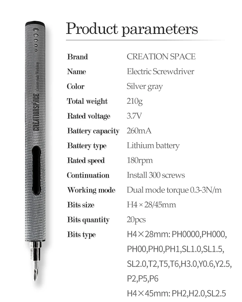 Package1 биты: H4 × 28 мм: PH0000,PH000,PH00,PH0,PH1,SL1.0,SL1.5,SL2.0,T5,T6,H3.0,Y0.6,Y2.5, P2,P5,P6. H4 × 45 мм: PH2,H2.0,SL2.5 Package2 биты: PH000,PH00,PH0,PH1,SL1.0,SL1.5,SL2.0,T2,T5,T6,T8,H2.5,H3.0,U3.0,Y0.6,Y2.5,△ 3,0, SQ0,P5,P6 Российский склад доставки биты isPackage1 биты, в то время как китайский склад доставки биты являются Package2 биты.