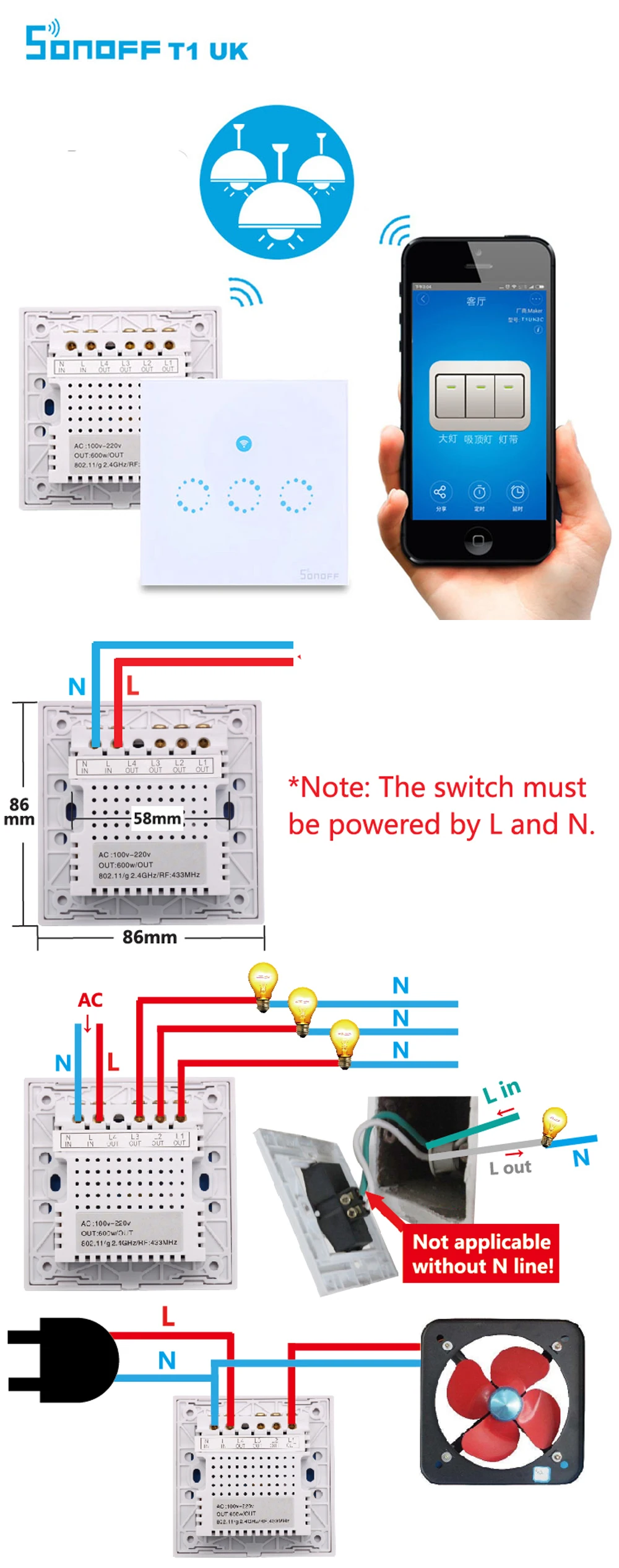 Sonoff T1 Wall Touch Switch Series-это умный выключатель света класса люкс с управлением 1-3 группы типа 86 Touch/App/RF. Беспроводной настенный выключатель может быть добавлен в приложение iOS/Android eWeLink через WiFi.
