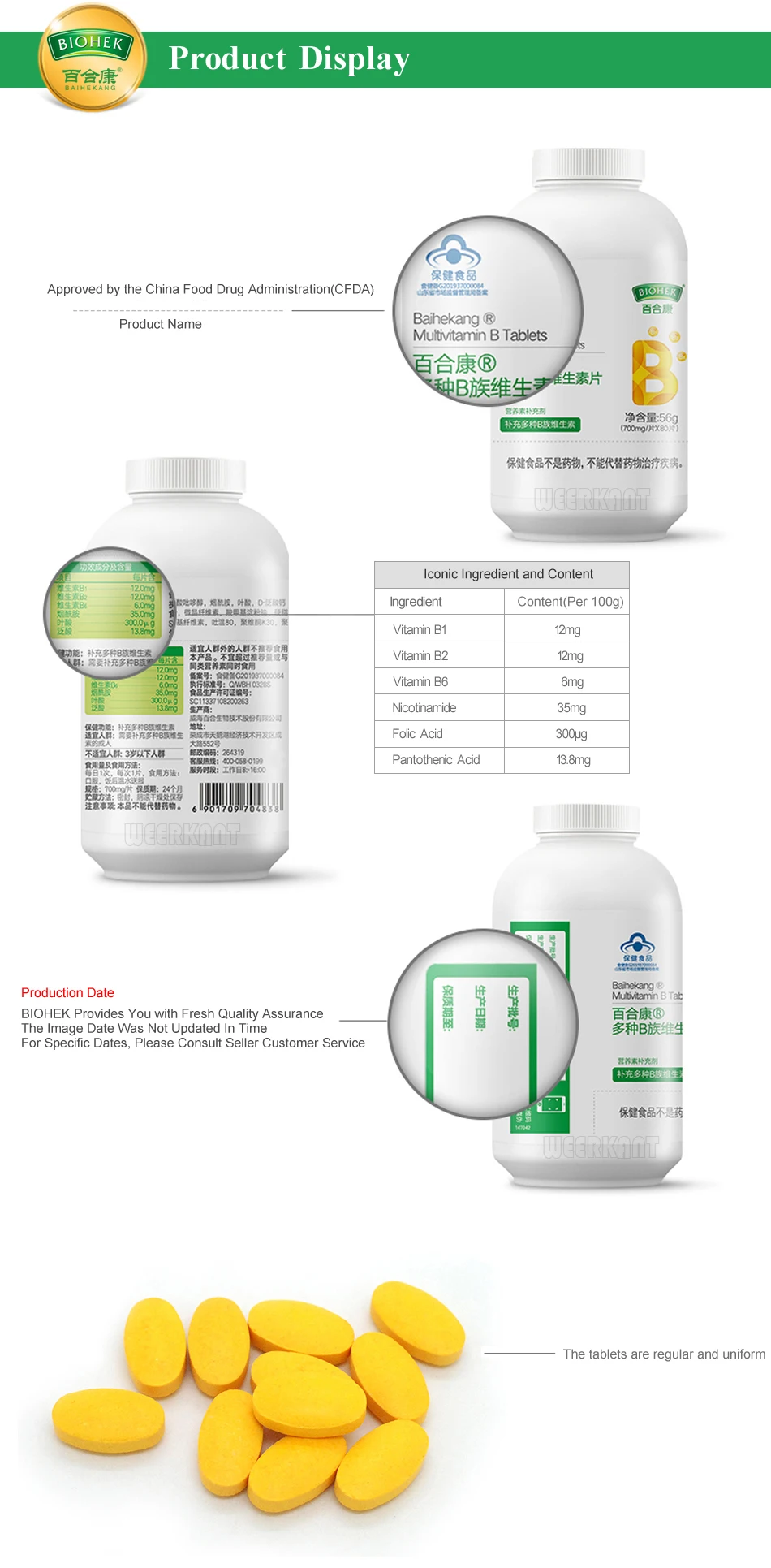 Таблетки витаминов группы в-это здоровое питание для восполнения организма человека витамином в серии. Его основные ингредиенты включают вв1, ВВ2, ниацин, пантотеновую кислоту, вв6, фолиевую кислоту. Внедрение передовой технологии покрытия эффективно улучшило ее вкус и обеспечило жизненную силу своих питательных веществ.