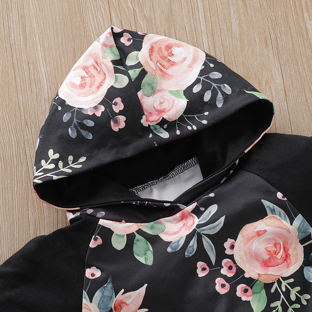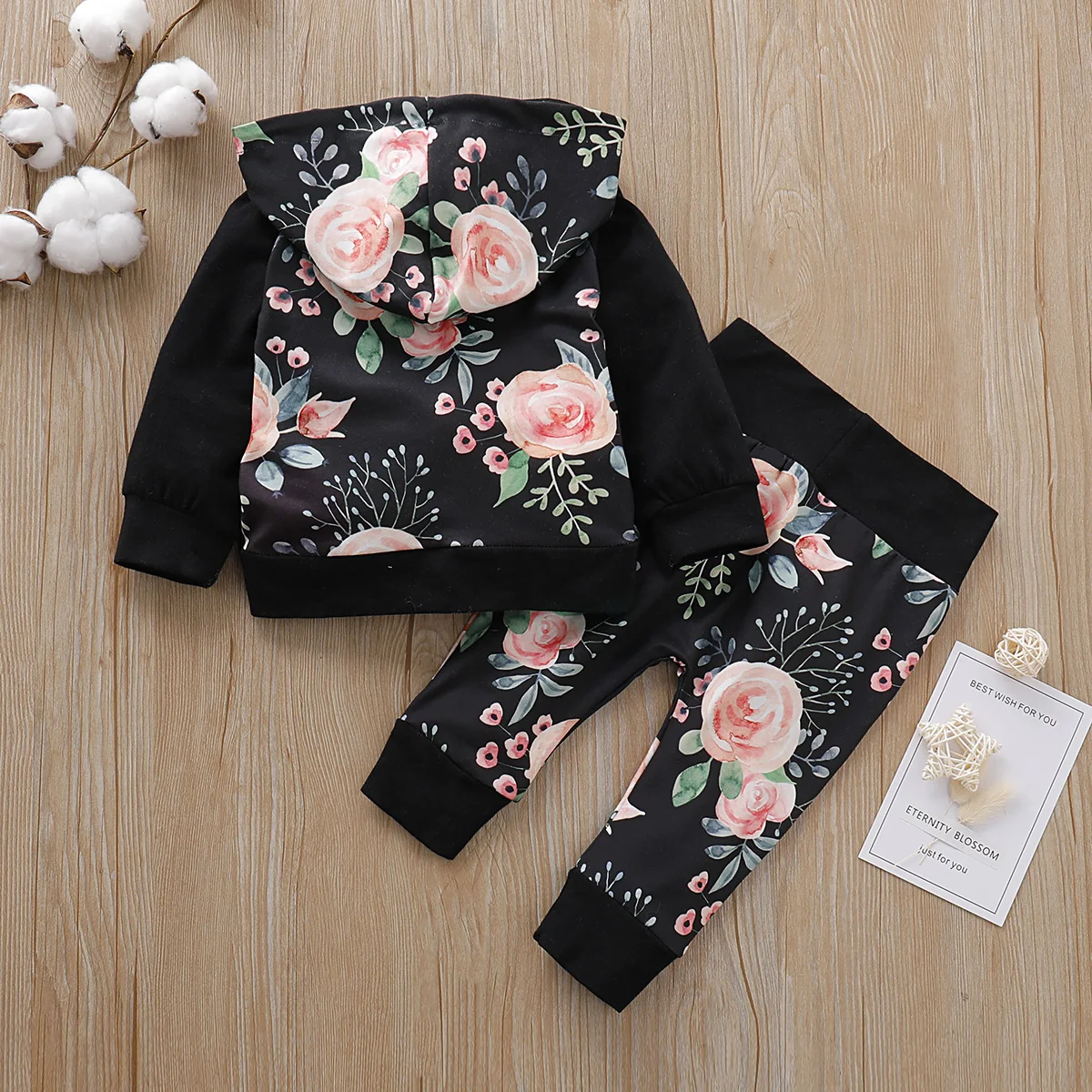 Осенне-зимний комплект одежды с цветочным принтом для детей 0-24 месяцев, толстовка с капюшоном + штаны для новорожденных, 2 шт./компл., одежда для маленьких девочек, 2019