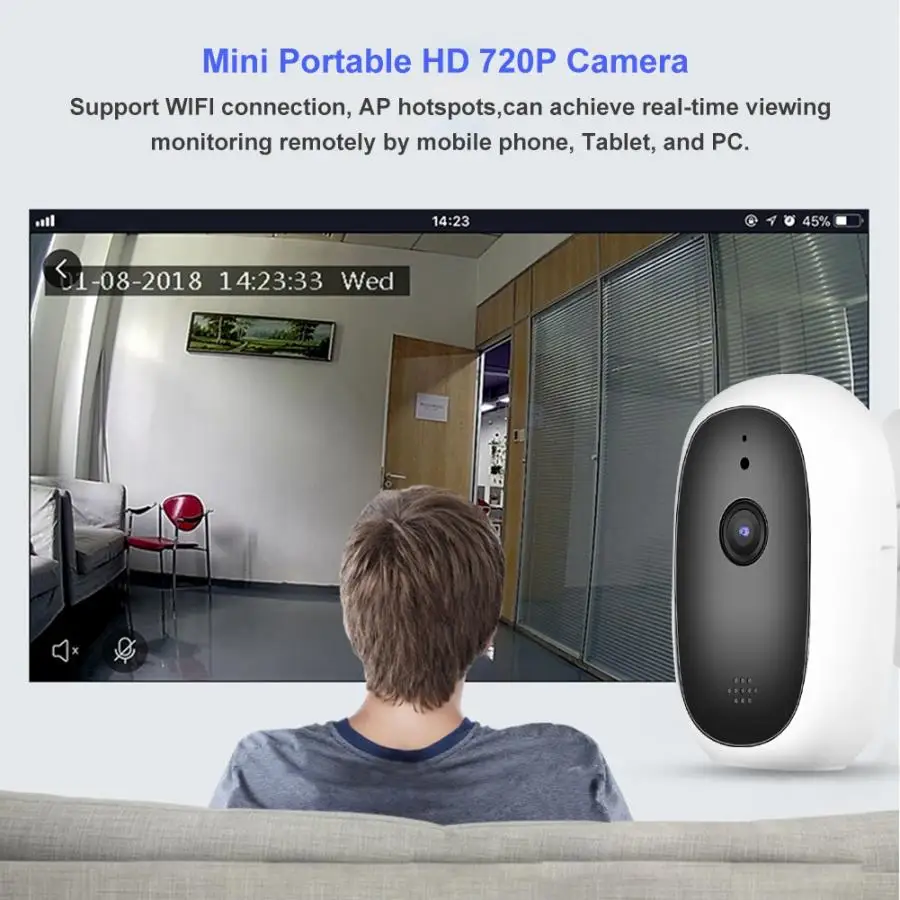 Мини Портативная HD 720 P камера с вращающаяся основа для регулируемого угла установки. IR-CUT двойной фильтр, может автоматически переключаться между днем и ночью. 10 инфракрасных огней, может достичь до 10 м расстояния ночного видения. Поддержка двухстороннего HD голосового домофона, обнаружения движения PIR, и мобильного приложения сигнализации толчка. С точками доступа вы можете смотреть экран монитора в режиме реального времени без сети. Поддерживает локальную память до 64 ГБ и Облачное хранилище. Поддержка подключения Wi-Fi, не требуется сетевой кабель. Может достигать мониторинга в реальном времени удаленно с помощью мобильного телефона, планшета и ПК. С мини-и милым внешним видом, можно разместить в детской комнате, ухаживать за ребенком в любое время и в любом месте.Цвет: как показано на картинке