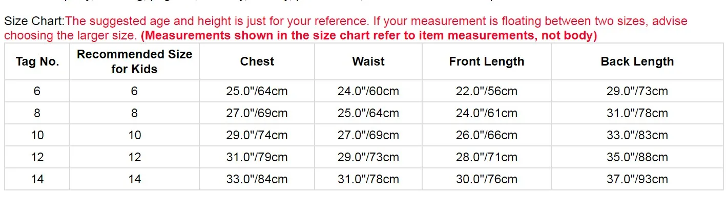 Размер на бирке. Рекомендуется Размеры для детей Обхват груди Обхват талии Передняя Длина Задняя Длина 6 6 25,0 "/64 см 24,0 "/60 см 22,0 "/56 см 29,0 "/73 см 8 8 27,0 "/69 см 25,0 "/64 см 24,0 "/61 см 31,0 "/78 см 10 10 29,0 "/74 см 27,0 "/69 см 26,0 "/66 см 33,0 "/83 см 12 12 31,0 "/79 см 29,0 "/73 см 28,0 "/71 см 35,0 "/88 см 14 14 33,0 "/84 см 31,0 "/78 см 30,0 "/76 см 37,0 "/93 смПолезные советы: Замеры делаются вручную, поэтому учитывайте небольшие погрешности. Цвет на фото может немного отличаться от реального товара из-за особенностей цветопередачи различных мониторов.