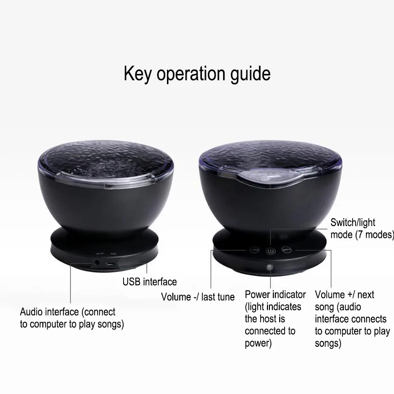 Особенности: Встроенный мини-музыкальный плеер Оснащен слотом для tf-карты (tf-карта не входит в комплект) и встроенным мини-динамиком, наслаждайтесь колыбельной музыкой, расслаблением, музыкой для медитации во время вставки tf-карты или подключения к внешнему источнику аудио. И есть четыре встроенных колыбельных музыки: звуки лесных насекомых, звуки морских чаек, звуки переливающихся птиц и веселые звуки природы. Экран с автоматическим вращением Внутренняя часть экрана волнистая, снаружи гладкая поверхность. Есть 12 супер ярких больших светодиодных чипов (4 красный светильник s, 4 синий светильник s, 4 зеленый светильник s) для создания красочной волны океана через светильник преломления и преобразования светильник. Расслабляющая атмосфера Успокаивающий мини-светильник для проектора, проектный светильник aurora borealis и небулярный светильник на потолке или стене, создает романтическую, расслабляющую, уютную атмосферу, успокаивает и успокаивает детей, а также идеально подходит для достижения расслабления, успокаивающий эффект. Разъем питания USB Правая сторона-это usb-интерфейс питания, а левая-аудиоинтерфейс. Вы можете подключить MP3 или мобильный компьютер для воспроизведения музыки через кабель. Двойное отверстие Конструкция с двумя отверстиями позволяет легко повесить на стену морские проекционные лампы. Умная сенсорная кнопка Кнопка-это переключатель и кнопка изменения режима светильник в течение 1 секунды для включения, и сенсорный светильник может изменить 7 видов режимов светильник, и нажмите и удерживайте в течение 1 секунды, чтобы выключить. Спецификация: Тип: лазерный проектор с изображением подсолнуха Количество: 1 шт. Материал: ПВХ + пластик Цвет: как показано Номинальное напряжение; DC5V Номинальный ток: ≤ 700мА Номинальная мощность: ≤ 4 Вт Мощность динамика: 3 Вт Время: 1 час Аудио Длина кабеля: 1,2 м Светильник режим: 7 Режим Размер: 12,5*12,5*9,7 см/4,9*4,9*3,8 ”(Д * Ш * В) Вес нетто: 285,0 г/10,1 унций Посылка: 1 * лазерный проектор с изображением подсолнуха