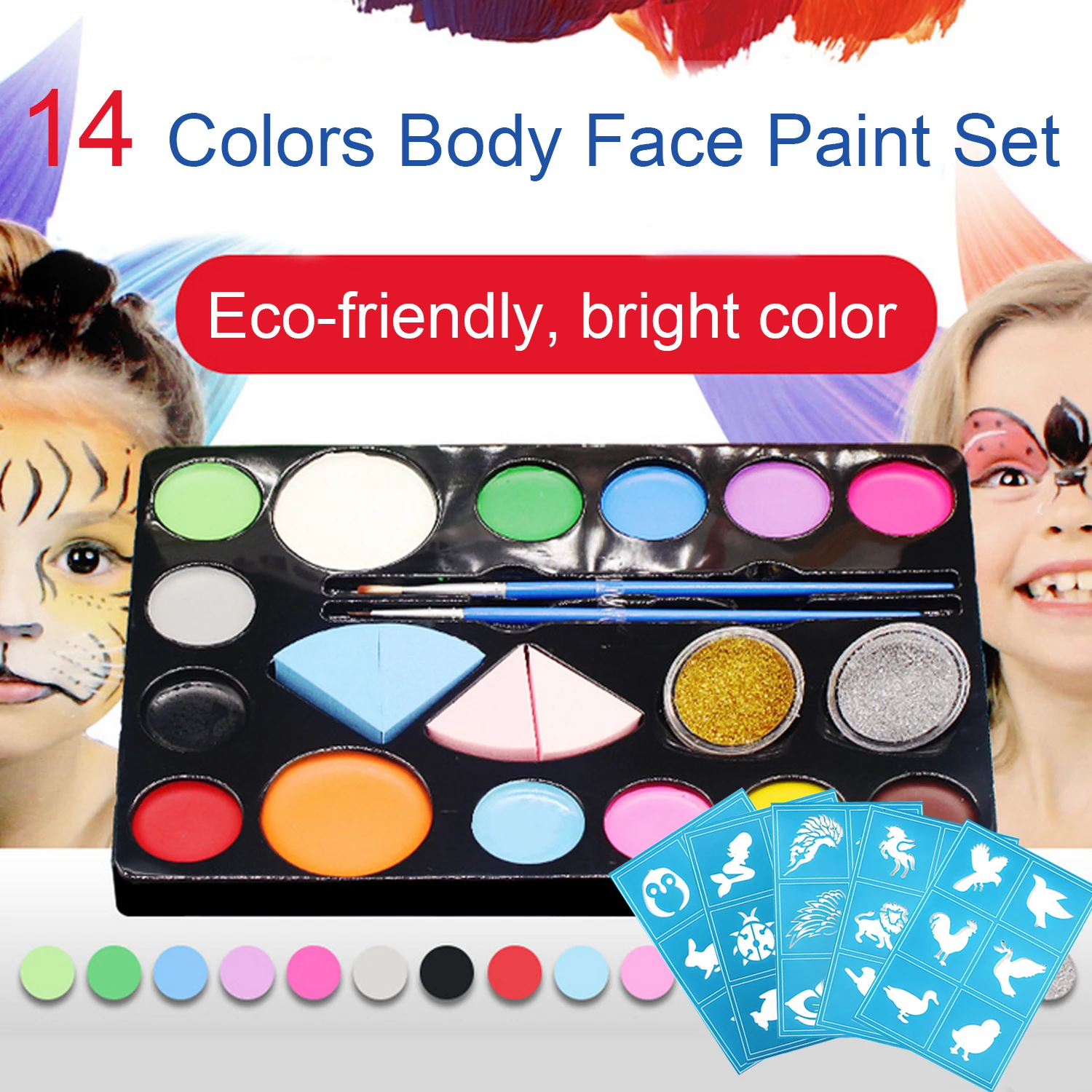 Посылка:14 ярких и ярких цветов с очень хорошее покрытие, 1 порошок золотого блеска, 1 серебристый блестящий порошок, 5 шт наклейки-трафарет, 4 листа многоразовые татуировки & nbsp; Наклейки-трафарет, 2 шт. кисти и 4 шт. губки. Достаточно краски дляБолее 100 лиц
