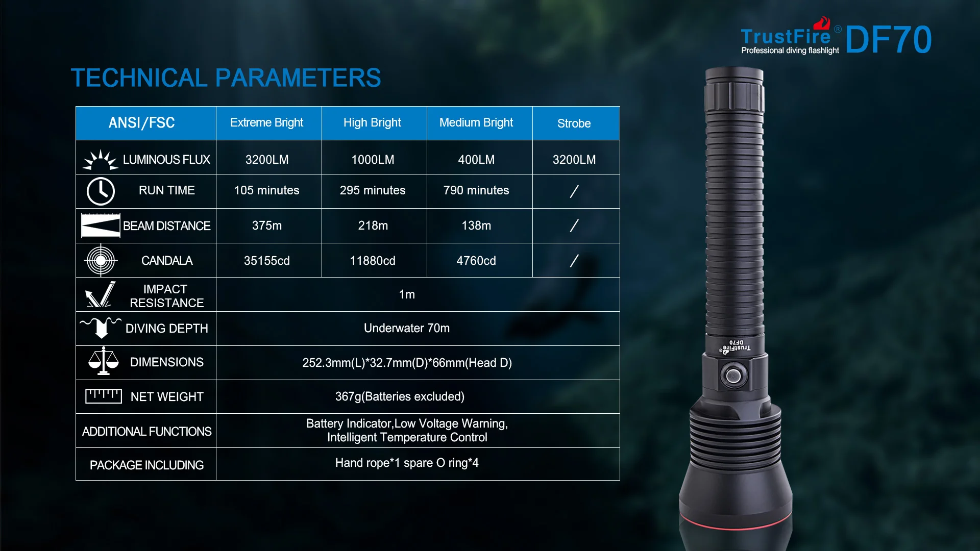 1/Профессиональная компрессионная Водонепроницаемая конструкция, глубина погружения до 70 метров. 2/используя международный запатентованный CREE XHP 70 светодиодный, срок службы составляет 50000 часов. 3/используя 2 шт. 3,6 V/3,7 V 26650 литий-ионных аккумуляторов. 4/252.3 мм (L) 32,7 мм (D) 66 мм (головка D). 5/вес нетто 367 г (батареи не входят в комплект). 6/схема постоянного тока, постоянная яркость. 7/интеллектуальное понижение и предупреждение низкого напряжения, продлевают время освещения и напоминают пользователю заменить его во время, когда оставшаяся мощность аккумулятора слишком мала. 8/Защита от обратного хода, предотвращение установки аккумулятора, нанесение вреда цепи. 9/Интеллектуальная настройка контроля температуры для предотвращения слишком горячей температуры корпуса (>60 °C), что влияет на удобство использования. 10/противоскользящий дизайн цилиндра. 11/он изготовлен из авиационного алюминиевого материала и с поверхностной антиизносной обработкой твердого анодного окисления. 12/использование двухсторонней Антибликовой пленки для упрочнения стеклянных линз может эффективно уменьшить потери на светильник. 13/с индикатором заряда батареи 2 цвета для отображения заряда батареи.