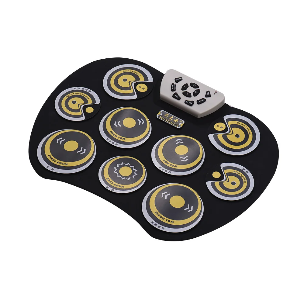 9 силиконовых барабанов, включая высокий Том, низкий Том, пол Том, Snare барабан, бас-барабан, ударный барабан, 2 * кататься барабан и открыть закрыть Привет-шляпа, обеспечивает вам отличные барабанные звуки, близкие к реальному набору барабана.