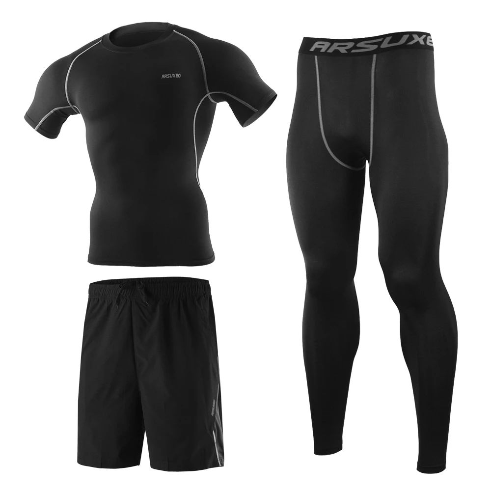 Комплект мужской одежды для тренировок из 3 предметов: компрессионная рубашка, Компрессионные Леггинсы, свободные шорты для бега.