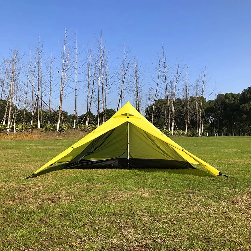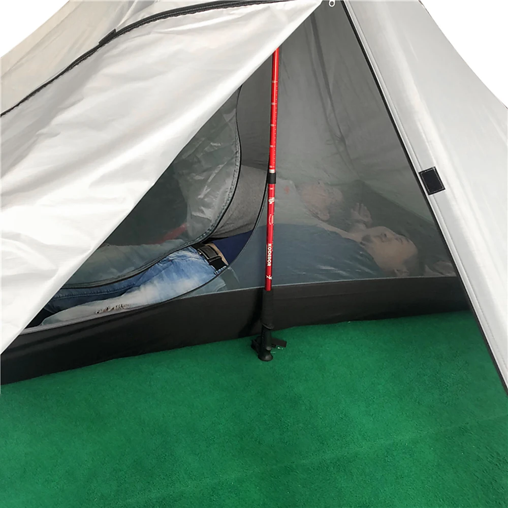 Этот тент разработан с двумя слоями: внутренний тент и тент наружный. Палатка изготовлена из высококачественного материала, водонепроницаемого и легкого. Его легко поддерживать ваш треккинг полюс, очень удобно.