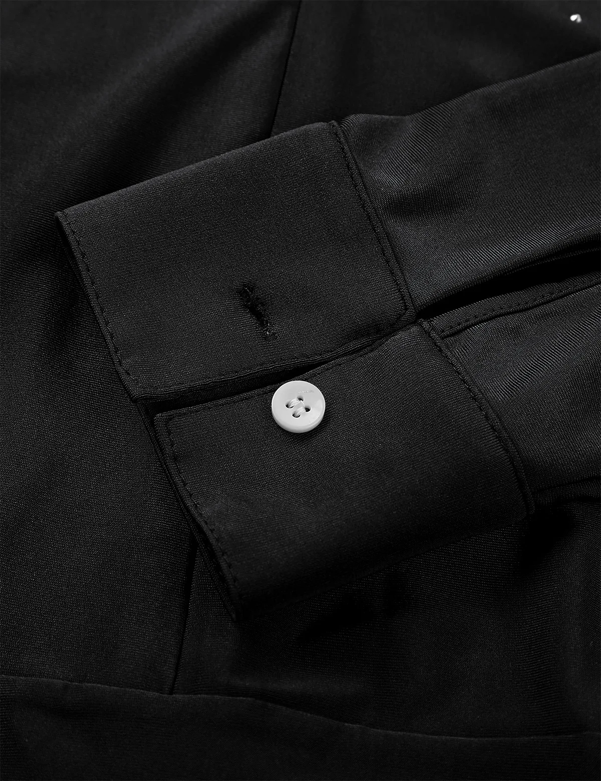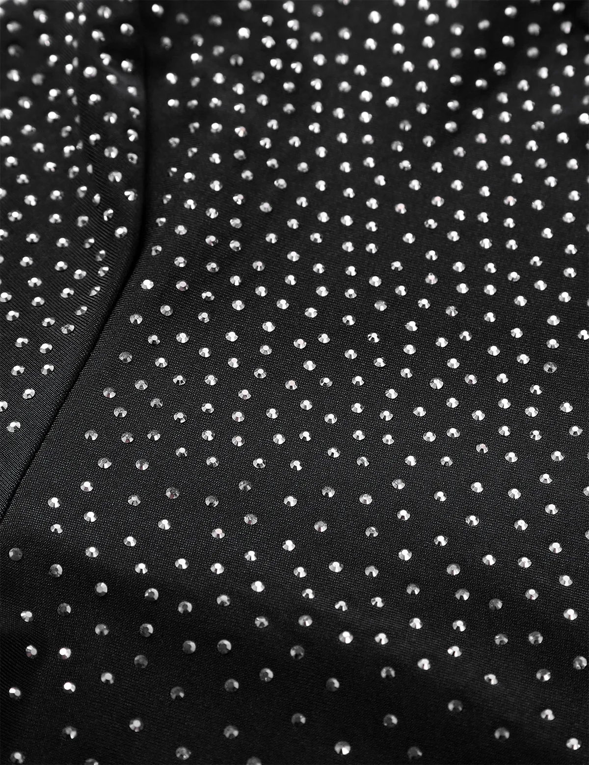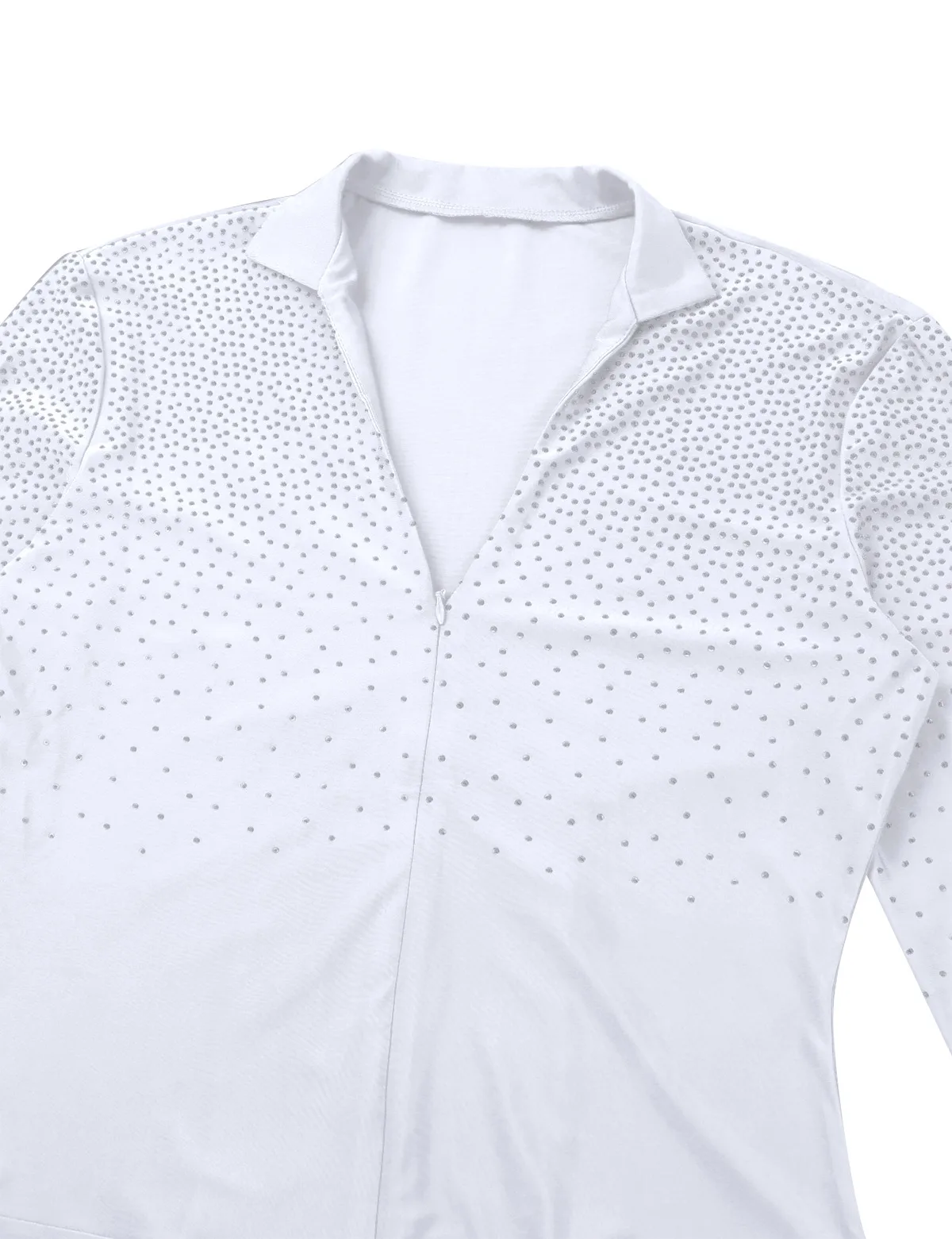 Одежда с длинным рукавом, v-образным вырезом и с воротником-стойкой, верхняя часть корсета с блестящие стразы, потайная застежка-молния спереди, с заниженным шаговым швом с 3 кнопки открытия.