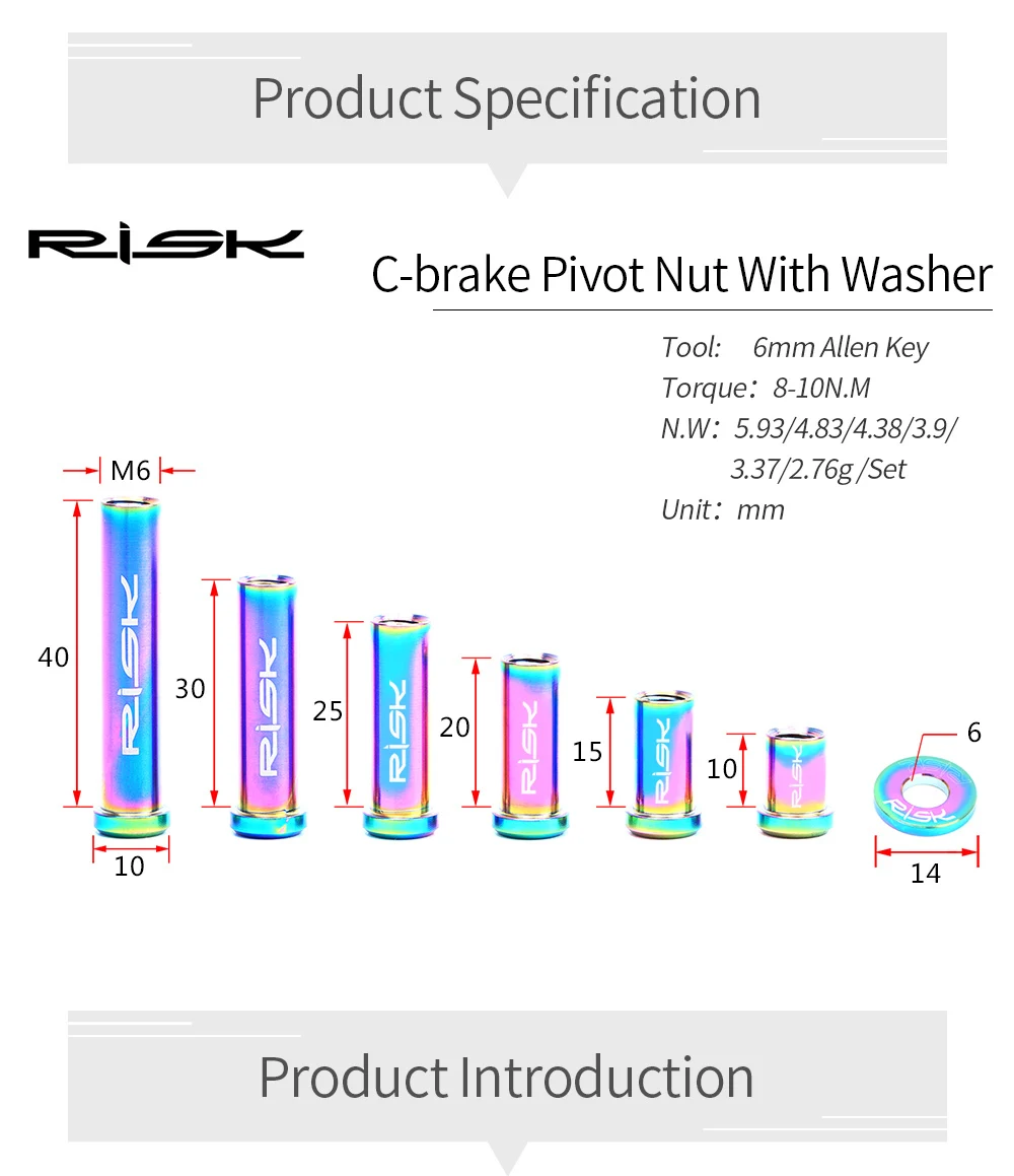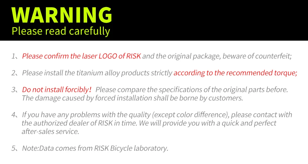 Пожалуйста, внимательно изучите данную информацию 1. Пожалуйста, подтвердите лазерный логотип риска и оригинальную посылка, остерегайтесь фальшивых изделий; 2. Пожалуйста, установите изделия из титанового сплава строго в соответствии с рекомендуемым крутящим моментом; 3. Не устанавливайте принудительно! Пожалуйста, сравните характеристики оригинальных деталей перед. Ущерб, причиненный принудительной установкой, несет заказчик. 4. Если у вас есть какие-либо проблемы с качеством (за исключением разницы в цвете), пожалуйста, свяжитесь с Авторизованный дилер риска вовремя. Мы предоставим вам быстрый и совершенный Послепродажное обслуживание. 5. Примечание: Данные получены из лаборатории по рискам для велосипедов.