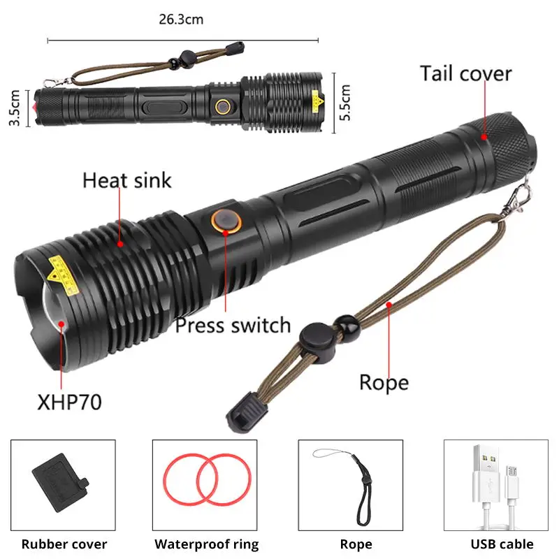 Brand: TRLIFE Model:1967 Light source: XHP90 Appearance color: Black Size: 26.3cm × 5.5cm × 3.5cm Power Supply : 2 x 26650 battery or 2 x 18650 battery Lighting time: 2-8 hours Charging Method: USB Direct Charging Range:200 to 500 meters Waterproof rating: IPX-6 Net Weight: 410g (without battery) Body Material: Aluminum Alloy Zoomable : Adjustable Focus Material: Aluminum Alloy 5 Switch Modes: 100%-70%-50%- Flash -double click SOS