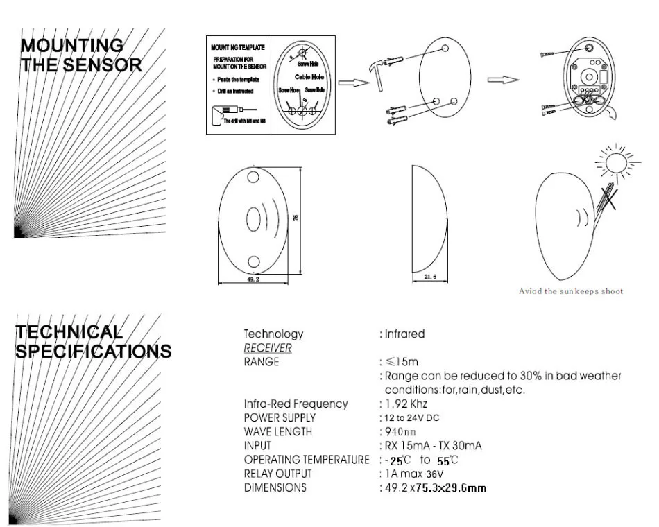 1.Установите каждую пару на противоположных позициях. Тогда возникнет инфракрасная область между двумя частями датчика. Когда кто-то будет проходит инфракрасную область, датчик будет посылать сигнал тревоги на главный узел охранной сигнализации (который не входит сюда). 2. Расстояние установки (макс.) в приведенной выше таблице означает максимальное расстояние установки между двумя частями датчика. 3. Идеально подходит для установки в системах безопасности в школе, офисном здании, больнице, домашнем дворе и т.д. 4. Диапазон обнаружения может быть уменьшен до 30% в плохих погодных условиях, таких как дождь, пыль и т.д. 5. В упаковку входит руководство по эксплуатации на английском языке. В руководстве по эксплуатации есть подробные инструкции. При прерывании инфракрасного луча, реле выпустит сигнал переключения, его можно использовать в качестве индукционного прибора для ограждения парковки, проходные ворота, ворота для транспортных средств. Он также может использоваться для обнаружения взлома окон, дверей и проходов.