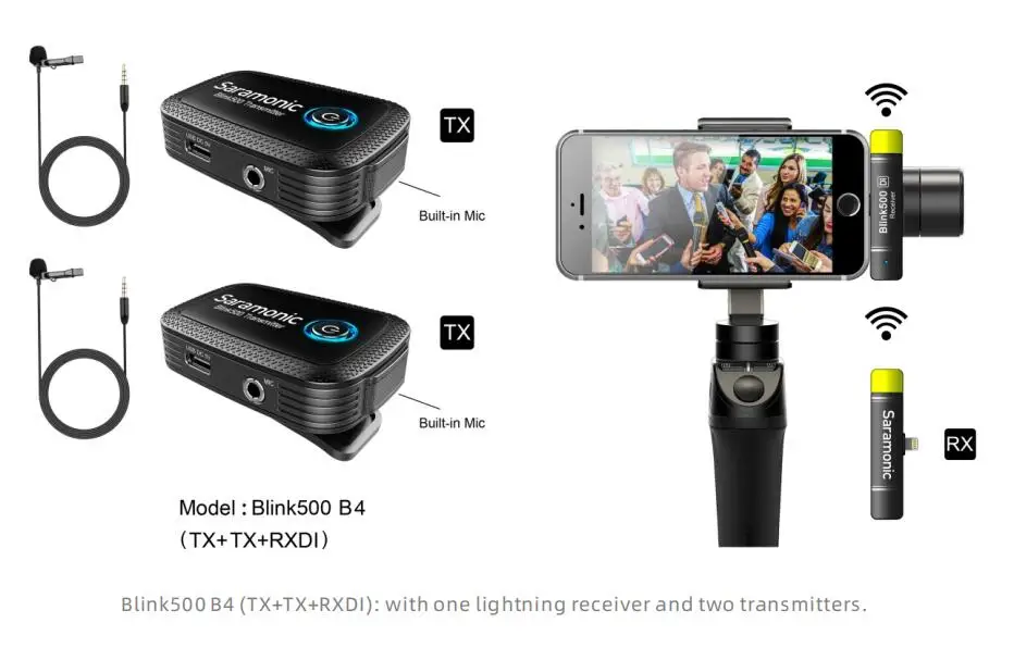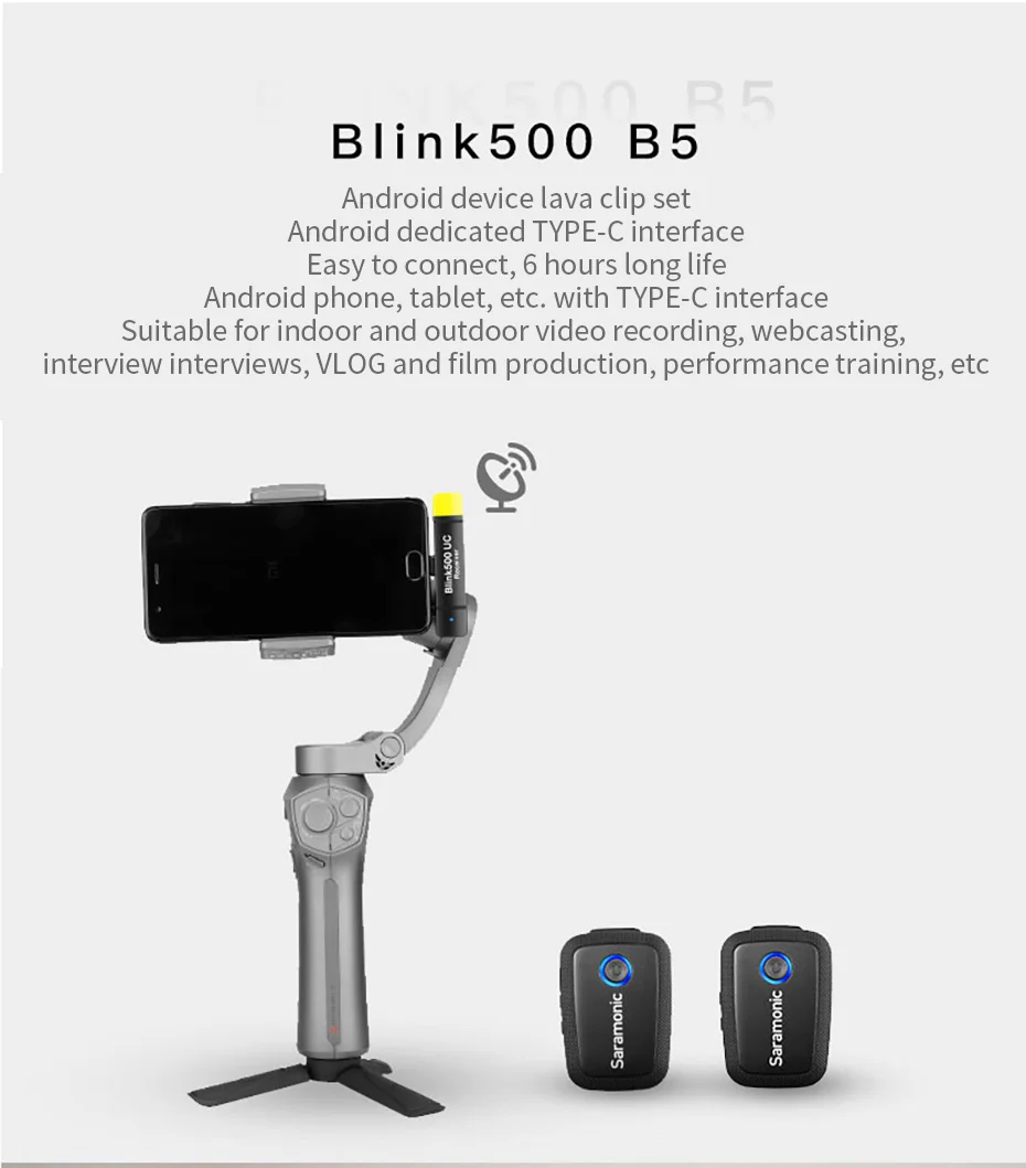 Blink500 B6 (TX + RXUC) ультракомпактный 2,4 ГГц двухканальный Беспроводной микрофон системы для цифровых зеркальных камер с петличный Saramonic Blink500 B6 является невероятно высокое качество, компактный, легкий, И простая в использовании двухместная Беспроводная микрофонная система для устройств с USB-C портами, такими как Android телефоны или планшеты, компьютеры и многое другое. RXUC не содержит батарею, эффективно работает и прекрасно работает при использовании в ручных каркасах. Передатчик с зажимом имеет большой встроенный микрофон, и он маленький и достаточно светильник, чтобы прикрепить рубашки и одежду, или вы можете использовать включенный SR-M1 профессиональный микрофон лавалье. Blink500 B6 делает использование нескольких беспроводных микрофонов с устройствами Android максимально простым. Он предоставляет два беспроводных передатчика и два микрофона lavalier, так что вы можете поместить микрофоны на двух отдельных людей с только одним приемником ultracompact на вашем телефоне Android.