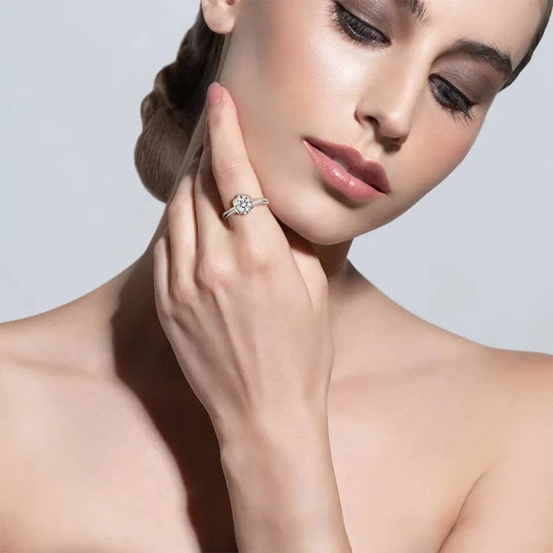 Элегантный цветок 1.0ct Moissanite 18K Настоящее Белое золото обручальные кольца предложить полосы ювелирные изделия для женщин невесты алмаз тест прошел