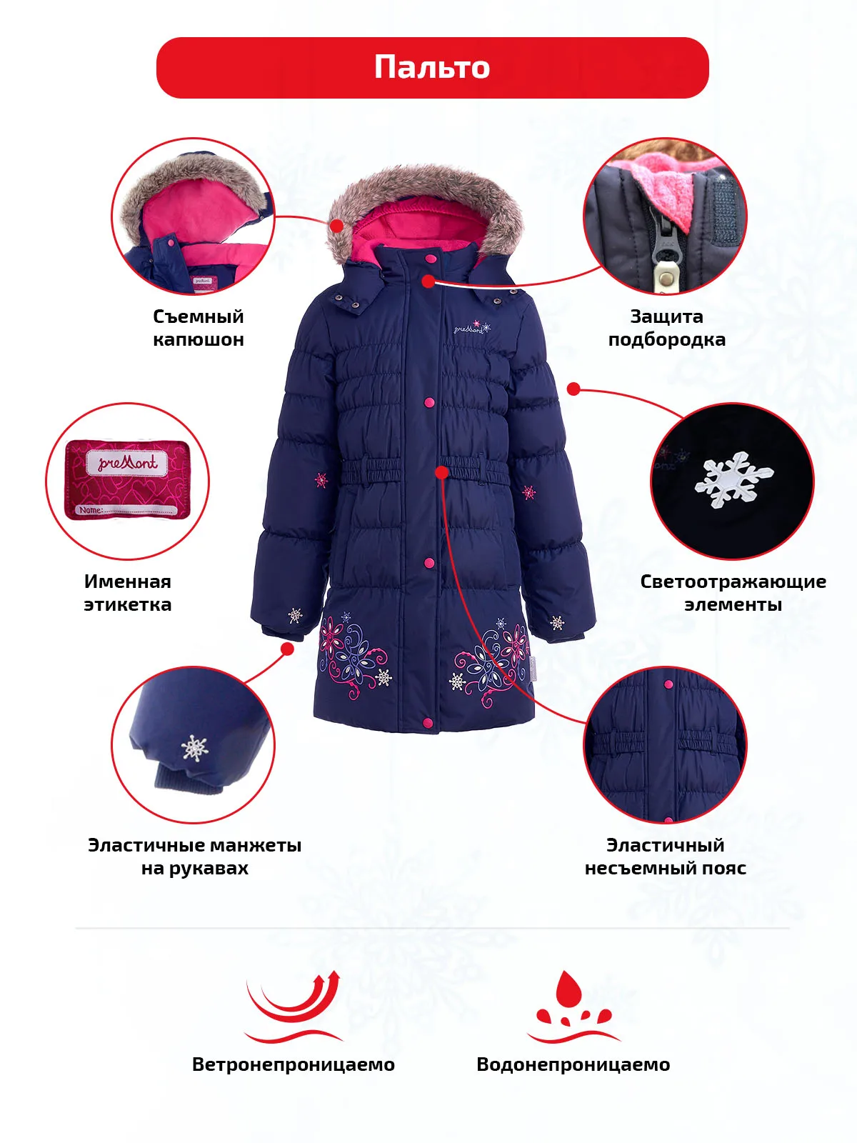 Detachable hood and отстёгивающийся fur-on zipper Extra utjazhki Hood (elastic band, stoppers) Wind Proof curtain inside Hood Hood fastens with two buttons on the chin strap Protection Chin Outer windproof Velcro strap Inner windproof bar Inner elastic cuff sleeves Elastic несъемный belt on the waist Elastic stitching inside hem jewelry Двухзамковая zipper Reflective elements (power cord, stripe, box, пуллеры) Inner chest pocket with Velcro Two pocket with Velcro Decorative embroidery with crystals Inner label with name