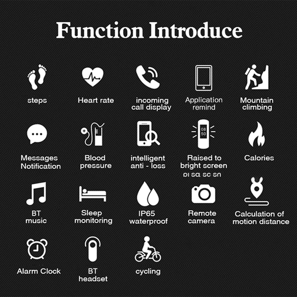 Функции: отображение даты времени, спорт, частота сердечных сокращений, кровяное давление, напоминания приложений, уведомления о сообщениях, ответ на вызов, регулировка яркости экрана, шагомер, шаг, калории, запись истории упражнений, удаленная камера, будильник, анти-потеря, BT гарнитура, BT Музыка, несколько языков.