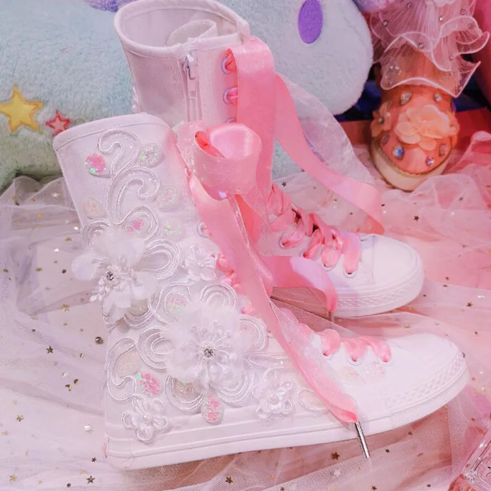 Женские ботинки до середины икры на шнуровке с цветочным принтом, розовые ботинки в байкерском стиле на шнуровке, женская обувь на платформе, T-055, осень 2019