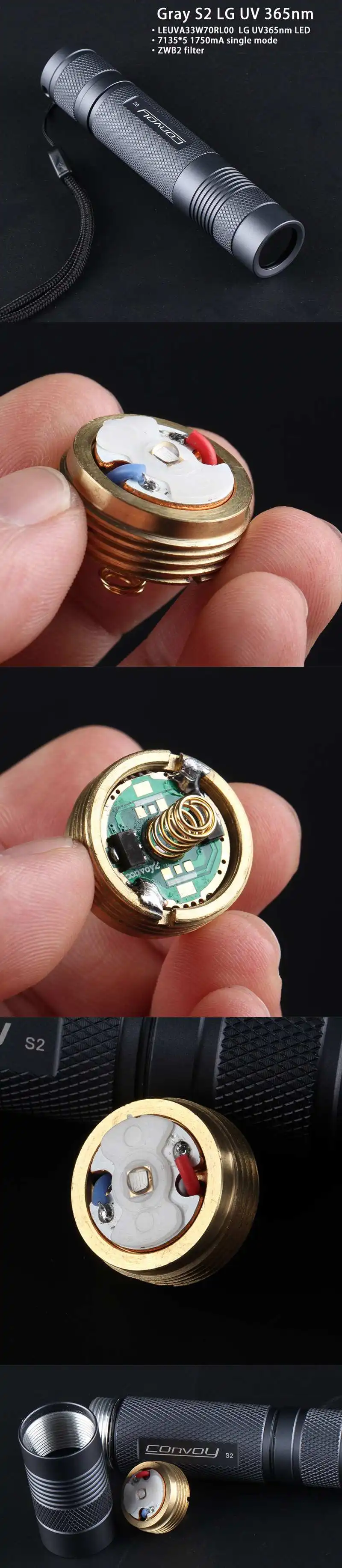 Бренд Конвой Материал Алюминиевый сплав Объектив Фильтр Ламповые бусины L.G 365nm band + термоэлектрическая разделительная медная пластина Длина подсветки 122 мм/4,80 дюйма Режимы Один режим Цвет Серый Вес 88,4 г