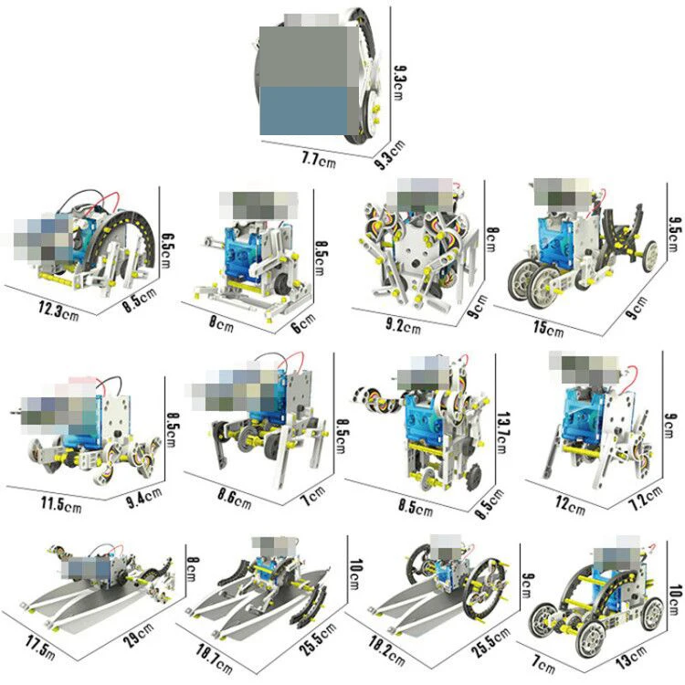 Абсолютно новое качество, Мудрая сборка, простая и быстрая! Нет отвертки, клея или провода! Упаковка изделия: без коробки С Инструкция на английском языке! Тип сборки: Собака с развевающимся хвостом, жук, который может бегать, ползающий краб, гусеничный, серфер, гоночная машинка, робот зомби, машинная лодка, робот ходунка, колесный робот, скользящий робот, робот-черепаха, робот-неваляшка, Четырехуровневый робот, машинная собака. Размеры после сборки Черепаховый робот: 12,3*8,5*6,5 см Ходунки робот: 8*6*8,5 см Четырехуровневый робот: 8,6*7*8,5 см Колесный робот: 17,1*9,3*9,5 Машинная лодка: 18,2*25,5*9 см Ракообразные: 11,5*9,4*8,5 см Машинная собака: 12*7,2*9 см Автомобильный робот: 13*7*10 см Робот-краб: 9,2*9*8 см Скользящий робот: 15*9*9,5 см Робот Budaoweng: 7,7*9,3*9,3 см Робот зомби: 8,5*8,5*13,7 см Робот для серфинга: 29*17,5*8 см Детский робот: 18,7*25,5*10 см