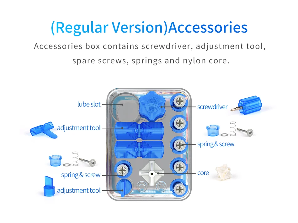. Аксессуары: паз смазки * 1 + система двойной регулировки * 1 + пружинный винт * 1 + система двойной регулировки * 1 + отвертка * 1 + пружинный винт * 1 + оси * 2, коробка может быть помещена в 3x3x 3 магический куб и отвертка после того, как отсек будет удален, что удобно для переноски и может эффективно защитить магический куб и защитить товары от нажатия