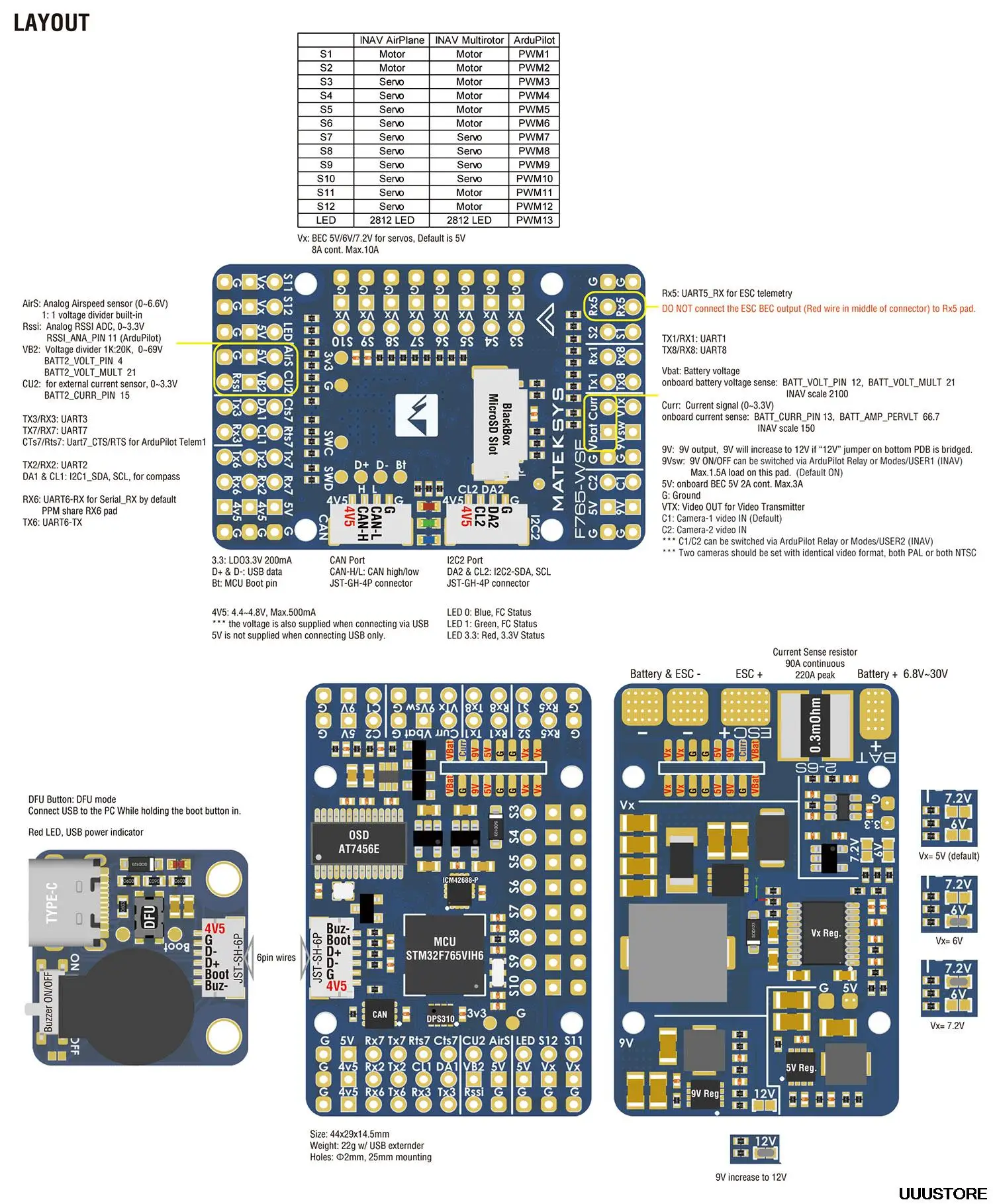 MCU: STM32F765VIH6, 216 МГц, КБ ОЗУ, 2 Мб флэш-памятиИду: ICM42688-P (SPI4)Baro: DPS310 (I2C2)OSD: AT7456E (SPI2)Черный ящик: слот для карты MicroSD (SDIO)6.5x Uarts (1,2,3,Rx5,6,7,8) со встроенной Инверсией.1x Softserial1_Tx (INAV)12 выходов PWM (S1 ~ S10 поддерживает Dshot)6x ADC (VBAT, ток, RSSI, аналоговая AirSpeed, VB2, CU2)3 светодиода для состояния FC (синий, красный) и индикатор 3,3 В (красный)2x I2C1x банкаUSB/звуковой удлинитель с Type-C(USB2.0)Двойной переключатель входов камеры9 в (12 В) для выключателя питания VTXВысокоточное чувство тока, диапазон аДелитель напряжения ADC VB2: 1K:20KДелитель напряжения авиационной скорости ADC: 20K:20KСтатическая мощность 160 мА @ 5 ВПрошивка FC