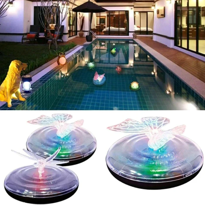 Solar powered light, 7 color changing LED, water floating lights,dragonfly or butterfly ornament