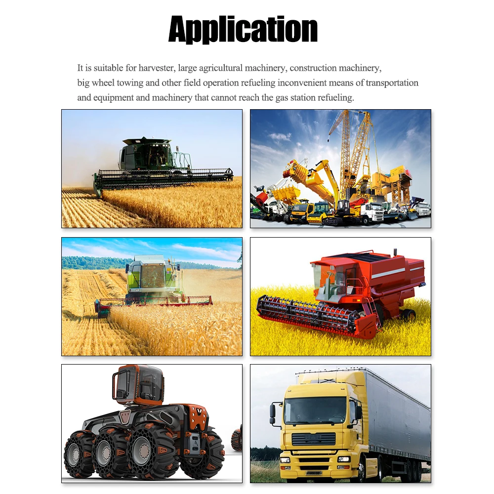 Подходит для комбайна, крупной сельскохозяйственной техники, строительной техники, буксировки больших колес и других полевых операций, заправка неудобными транспортными средствами, оборудованием и оборудованием, которые не могут добраться до заправки АЗС.