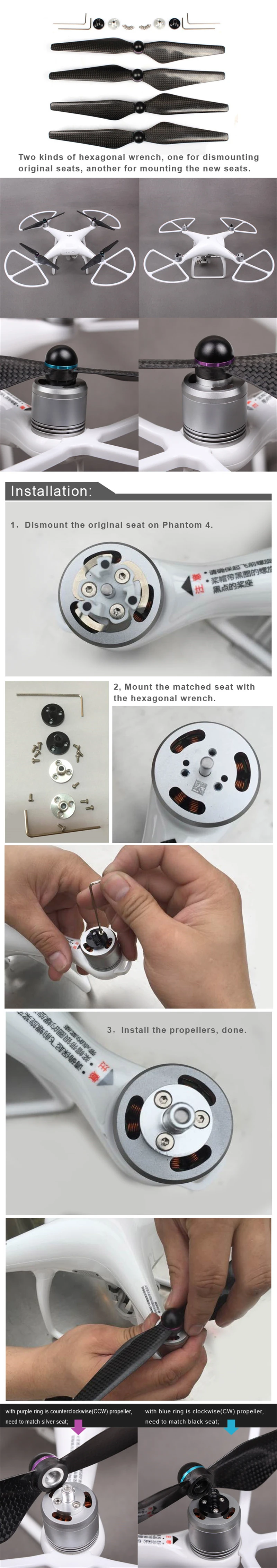 Установка: 1. Демонтаж оригинального сиденья на фантоме. 2. Установите подходящее сиденье с шестигранным ключом. 3. Установите пропеллеры, сделано.