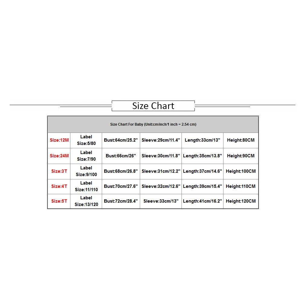 Таблица размеров для ребенка (Единица измерения: см/дюйм/1 дюйм = 2,54 см) Размеры:Размеры от 12 мес. Размер этикетки: 5/80 Обхват груди: 64 см/25,2 дюйма Рукав: 29 см/11,4 дюйма Длина: 33 см/13 дюймов Рост: 80См Размер: 24 м Размер этикетки: 7/90 Обхват груди: 66 см/26 дюймов Рукав: 30 см/11,8" Длина: 35 см/13,8 дюйма Высота: 90См Размер: 3T Размер этикетки: 9/100 Обхват груди: 68 см/26,8 дюйма Рукав: 31 см/12,2" Длина: 37 см/14,6 дюйма Высота: 100См Размер: 4T Размер этикетки: 11/110 Обхват груди: 70 см/27,6 дюйма Рукав: 32 см/12,6" Длина стрелка: 39 см/15,4" Высота: 110См Размер: 5T Размер этикетки: 13/120 Обхват груди: 72 см/28,4 дюйма Рукав: 33 см/13 дюймов Длина: 41 см/16,2 дюйма Высота: 120См