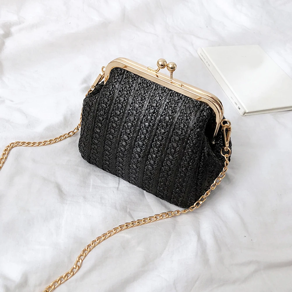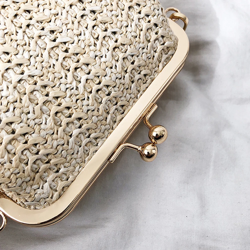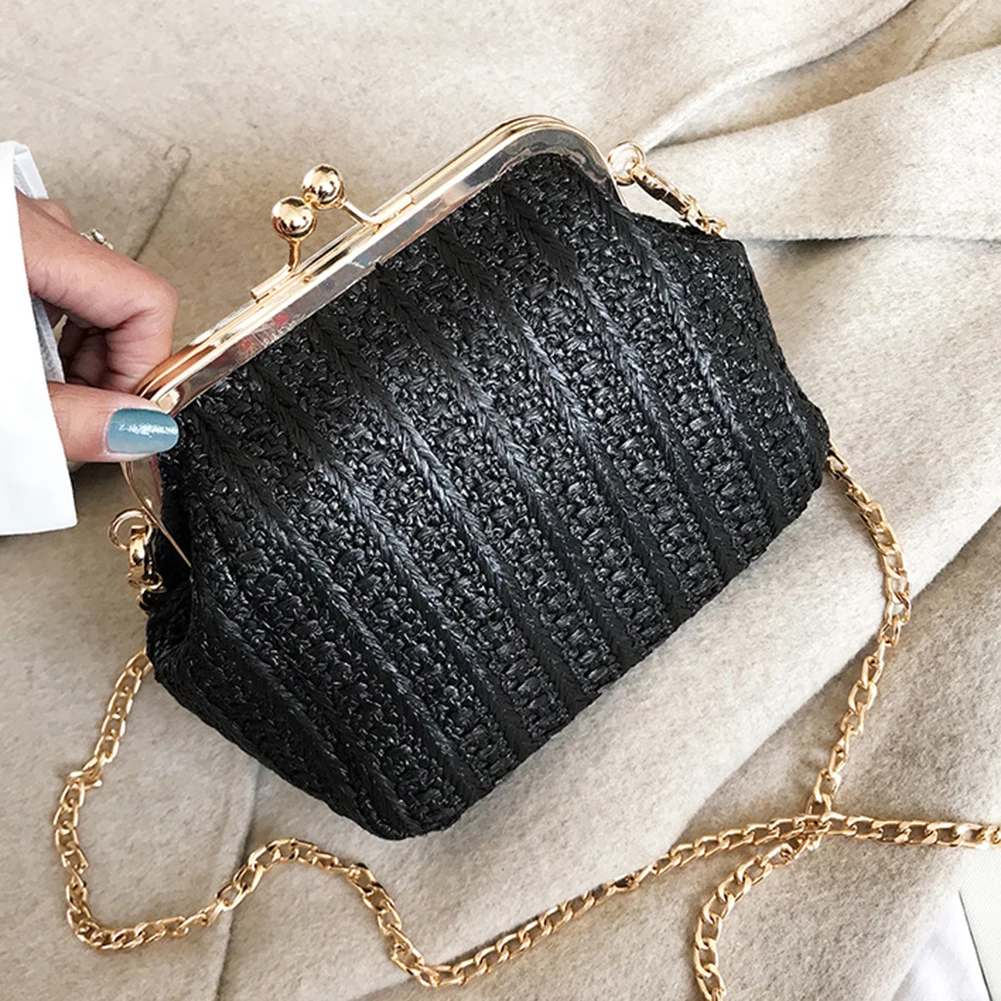 Fashion Summer Beach Women Kiss Lock Straw Woven Chain Crossbody Shoulder Bag