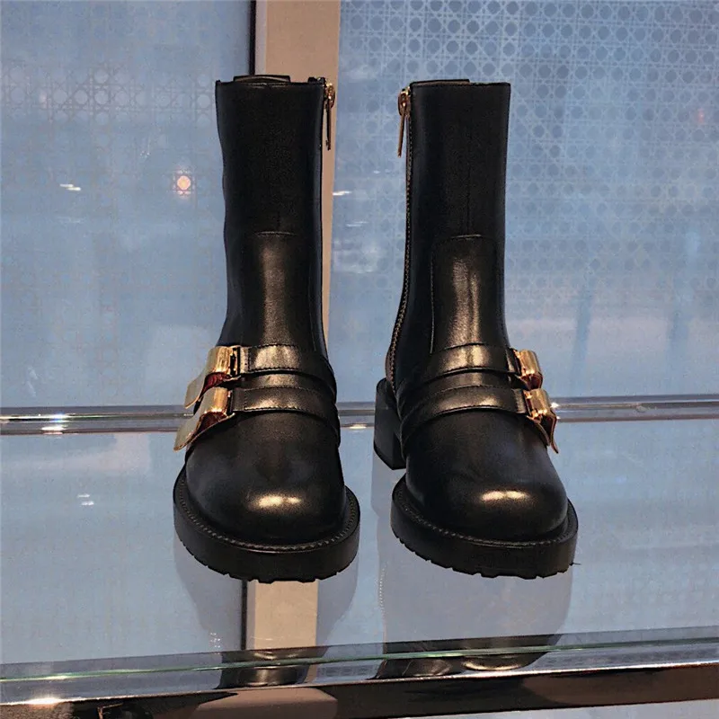 Металлическая пряжка; кожаные ботинки; женские черные кожаные ботинки на плоской подошве с круглым носком и молнией; Новинка 2019 года; зимние женские мотоциклетные ботинки