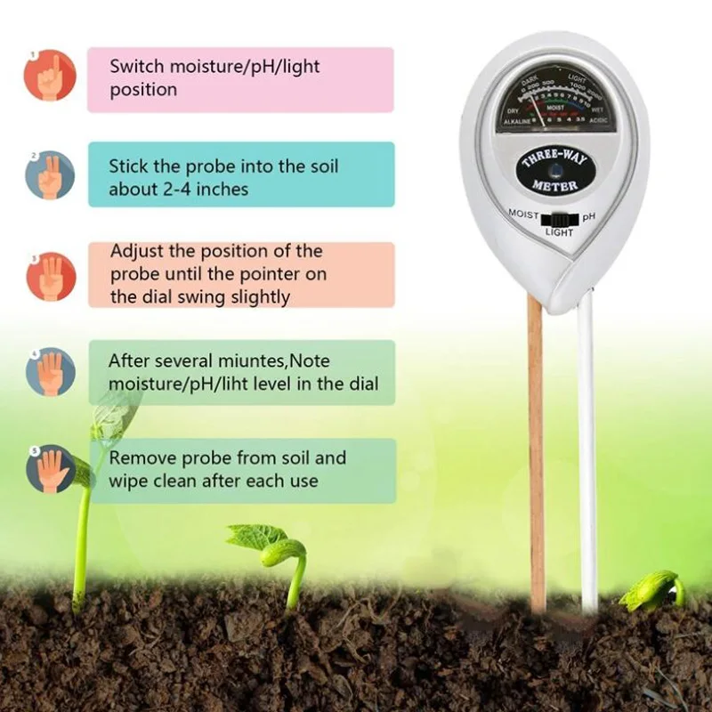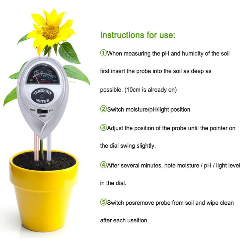 3-in-1 function design, can test soil illuminance, PH value, humidity, wide range of applications, can be used in a variety of scenarios The arrow pointer is positioned accurately, the wide scale interval is large, the large number is displayed, the scale is clear and clear, and the reading is easy Plastic panel, frame, sturdy and durable, not easily deformed Double-needle design for quick and accurate detection and analysis of soil illuminance, pH, humidity, etc. Physical induction, no battery, plug and play, easy to use specification: Measuring range: illuminance, humidity value, pH value Operating ambient temperature: 5-50 °C Probe length: 178cm How to use: Insert into the soil