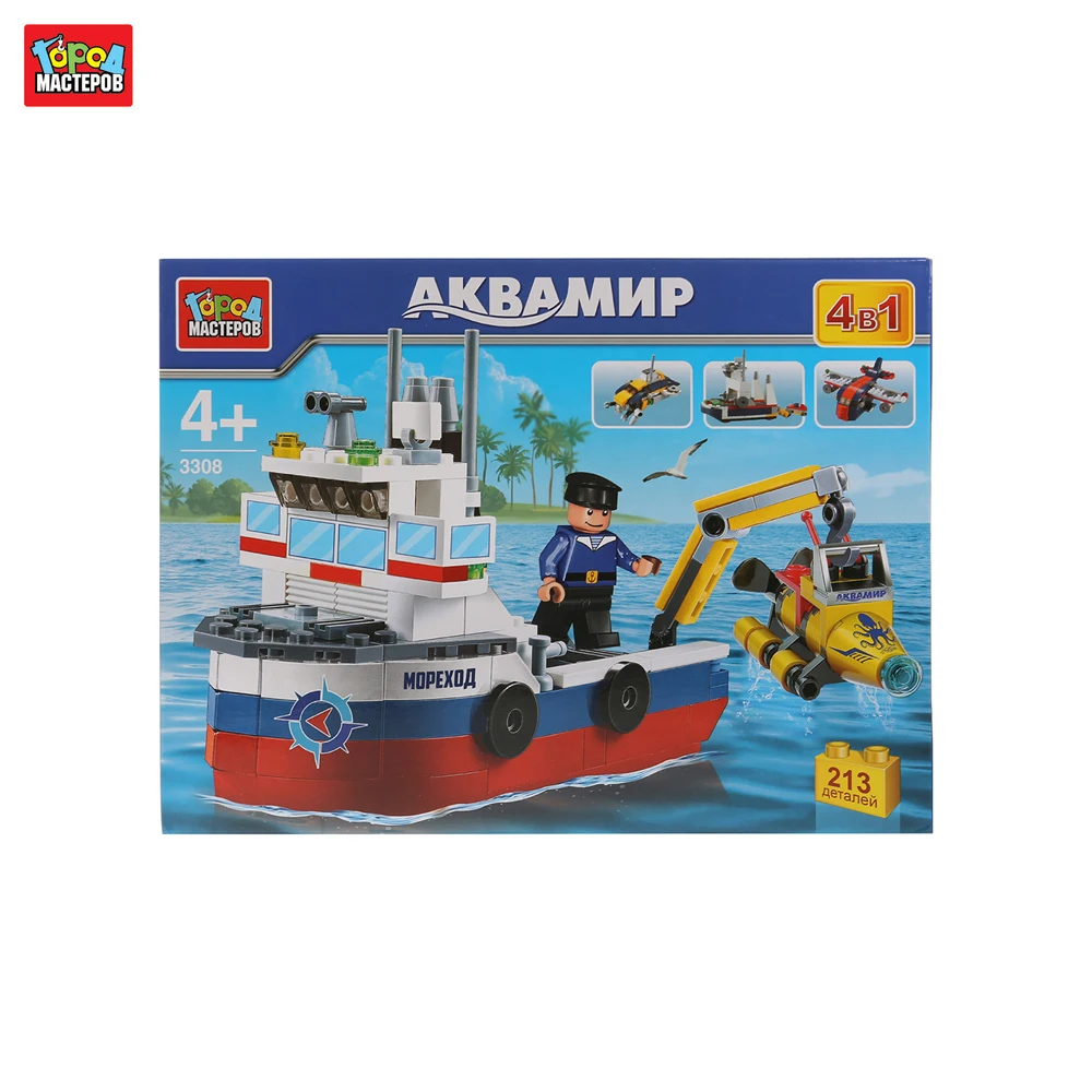 Конструктор "Корабль с батискафом" 4 в 1 - это набор серии "Аквамир". В него входит 213 деталей, сделанных из прочного пластика и окрашенных в яркие цвета. Из них можно собрать 4 различные фигуры и 1 баискаф. Все детали прочно крепятся друг к другу. Собрав фигурки, ребёнок сможет создавать различные игровые сюжеты.