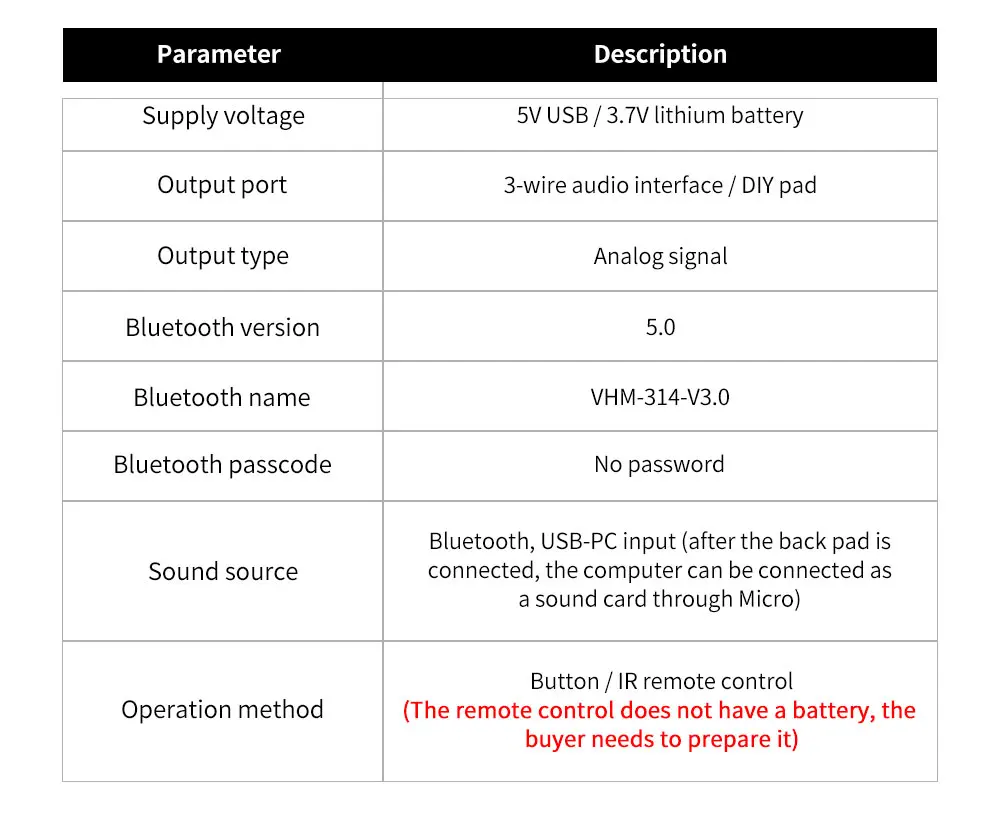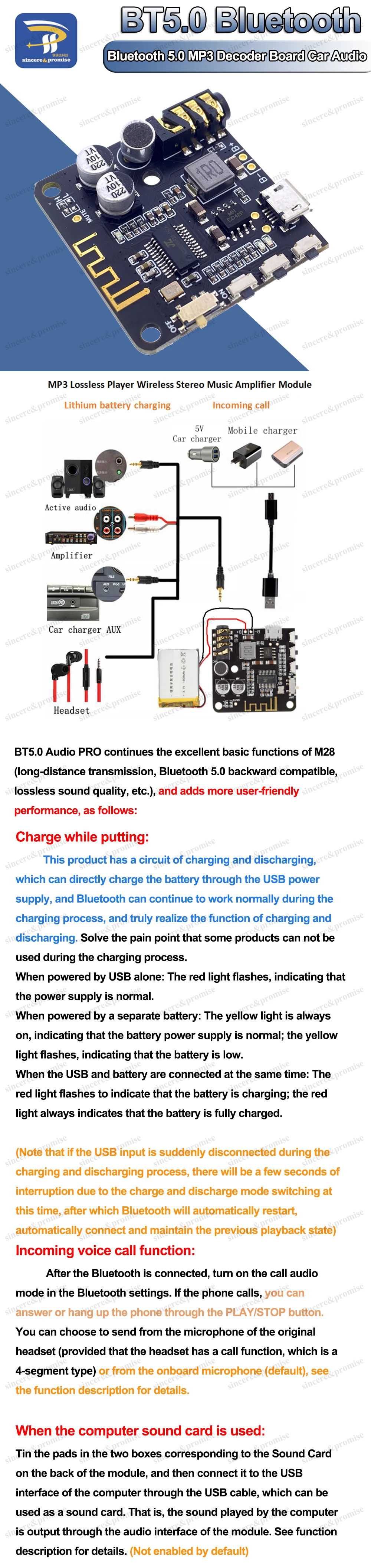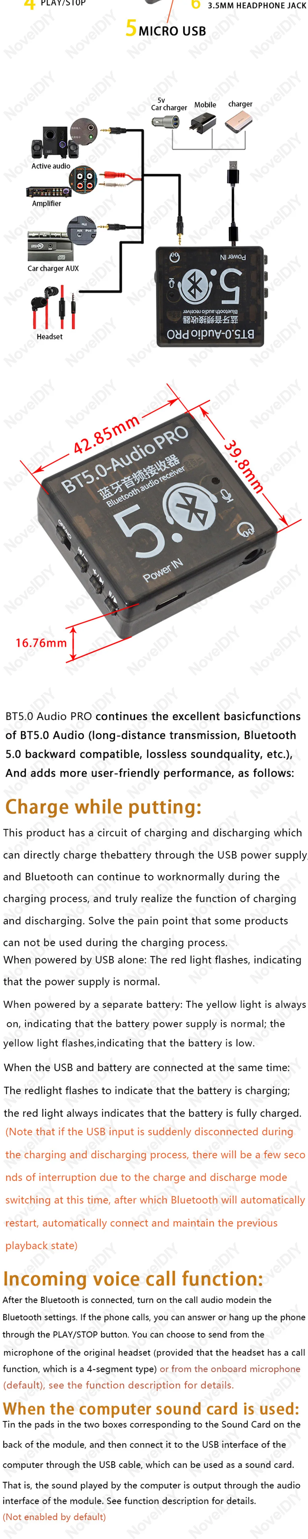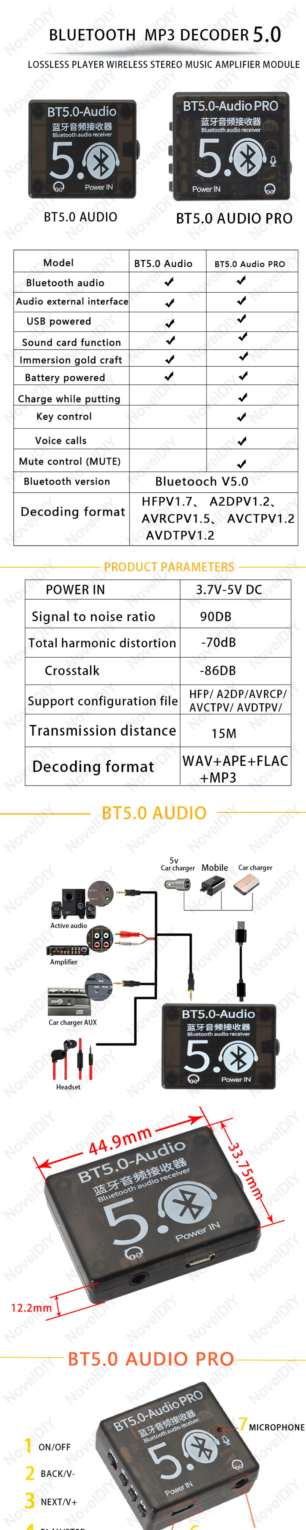 Поддержка Bluetooth 4,0 4,1 4,2 5,0, поддержка автоматического подключения, WAV + APE + FLAC + MP3 декодирование без потерь, стерео выход.