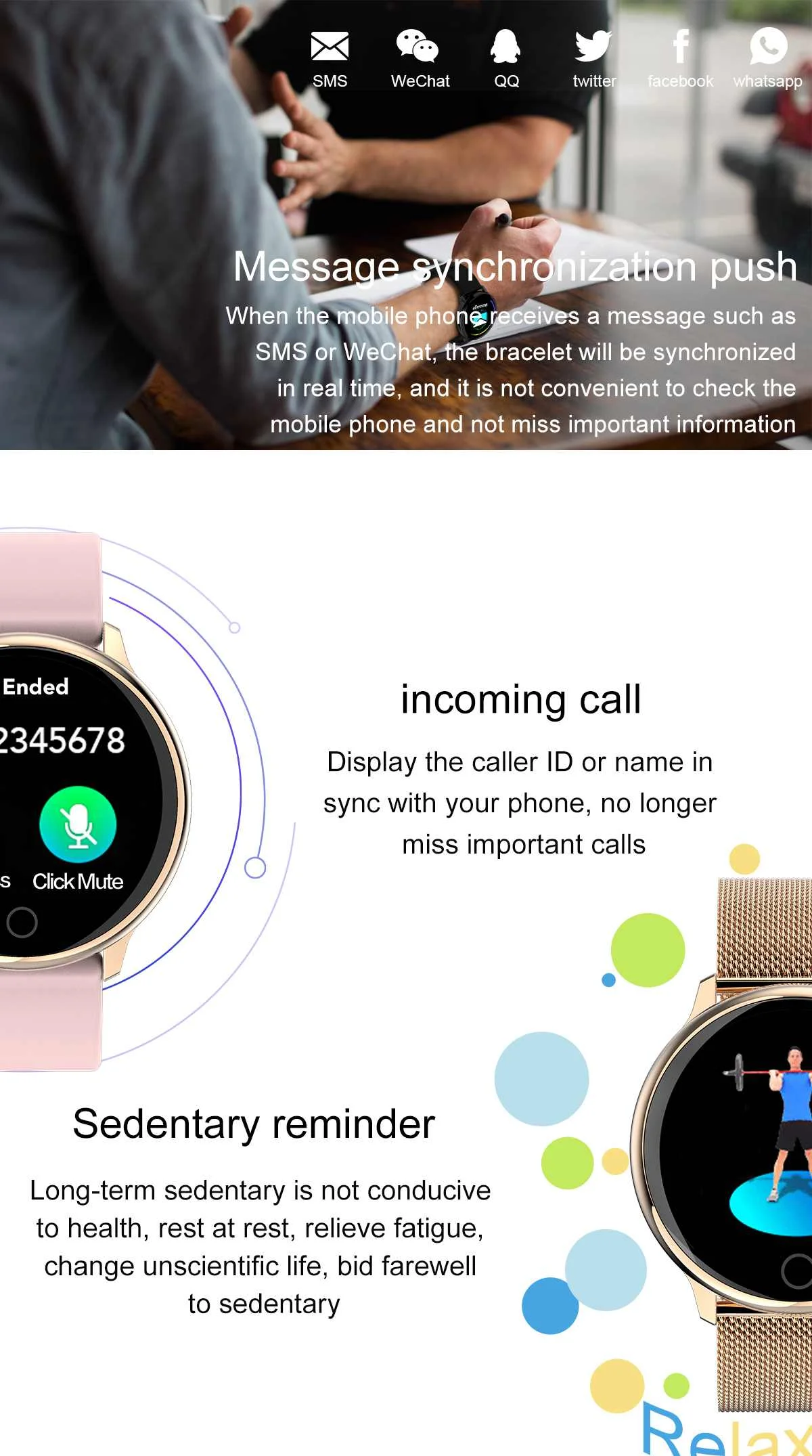 Другие функции поддерживают будильник, календарь, напоминание о сидячем положении, дистанционное управление камерой, защита от потери,