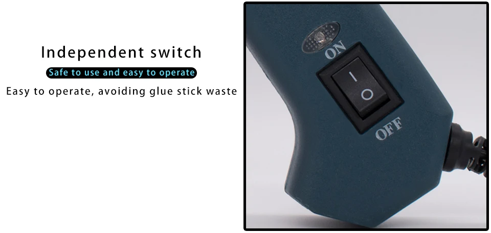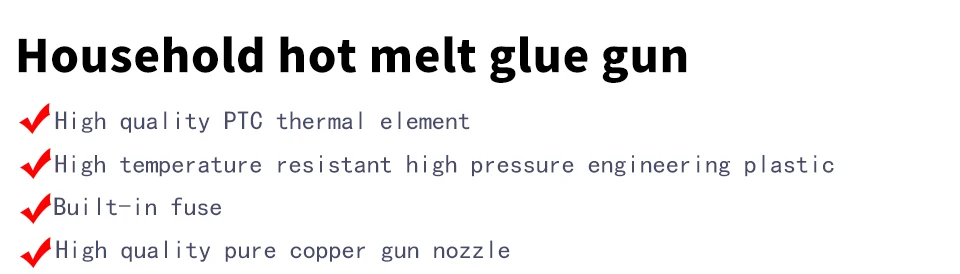 4. Glue gun shape is made of high temperature insulating plastic processing. Equipped with a power light and the length of 1.5 m power cord with international standards. With automatic constant temperature, power supply safe, long life characteristics.