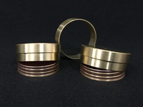Вы показываете две латунные крышки и кольцо. Колпачки считаются пустыми, а кольцо не подготовлено. Вы переворачиваете одну из кепок и мгновенно под кепкой появляется стек из пяти монет.
