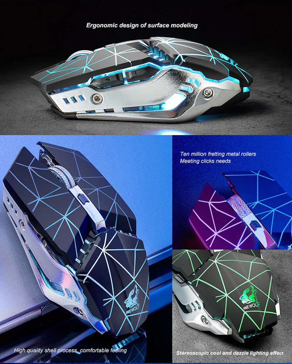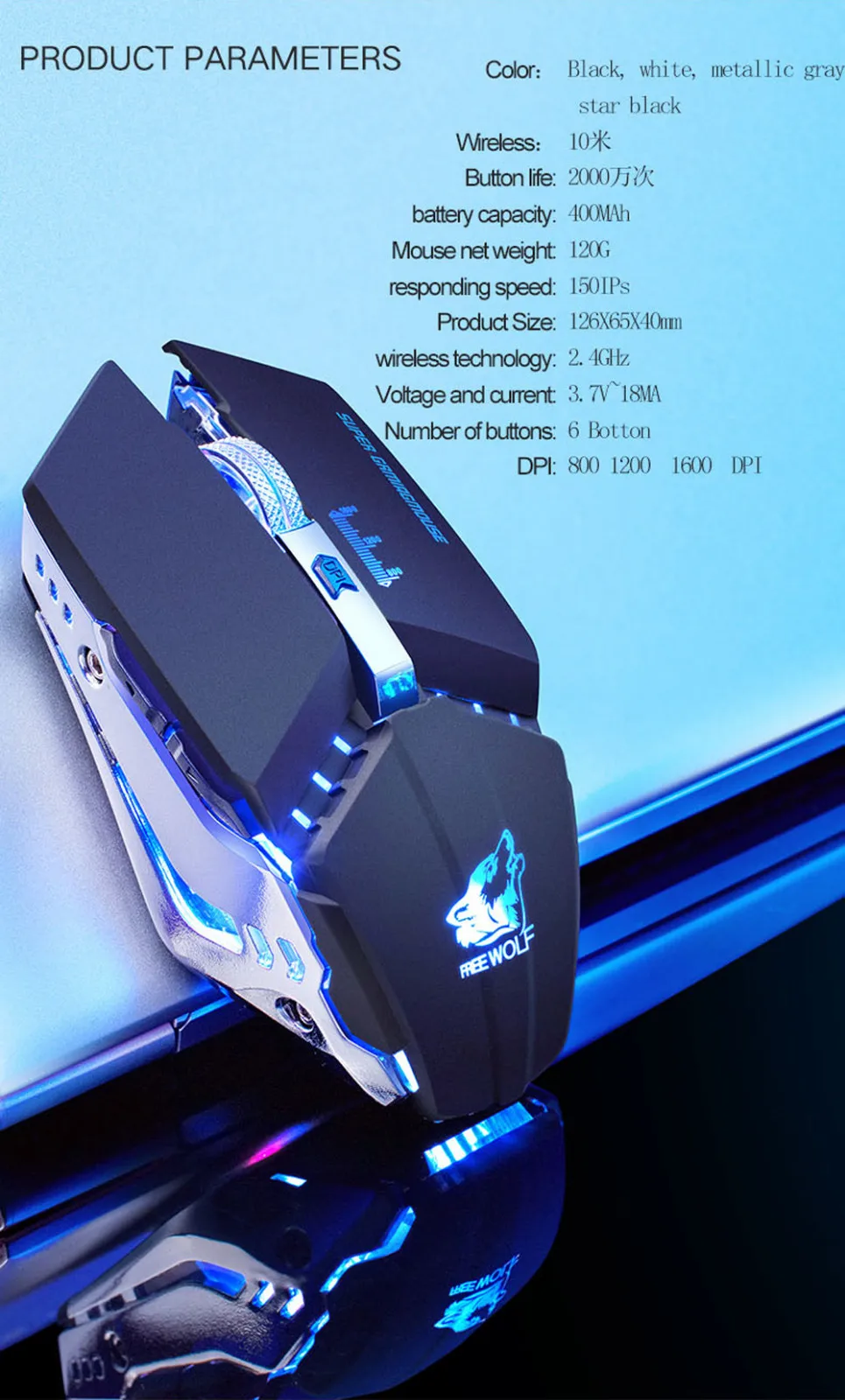 1. Высокопроизводительная Беспроводная игровая мышь. Предоставьте все основные функции игры, которые вам нужны. 2. Ультра Быстрые кнопки отклика, отслеживание и скользящее управление имеют отличную производительность. 3. Наиболее подходит для пользователей ноутбуков и ПК. 4. Нет кода, подключи и работай, чувствую себя комфортно. 5.3D металлические противоскользящие ролик 6. Характеристики светового эффекта: phantom seven color breathingСпецификация: